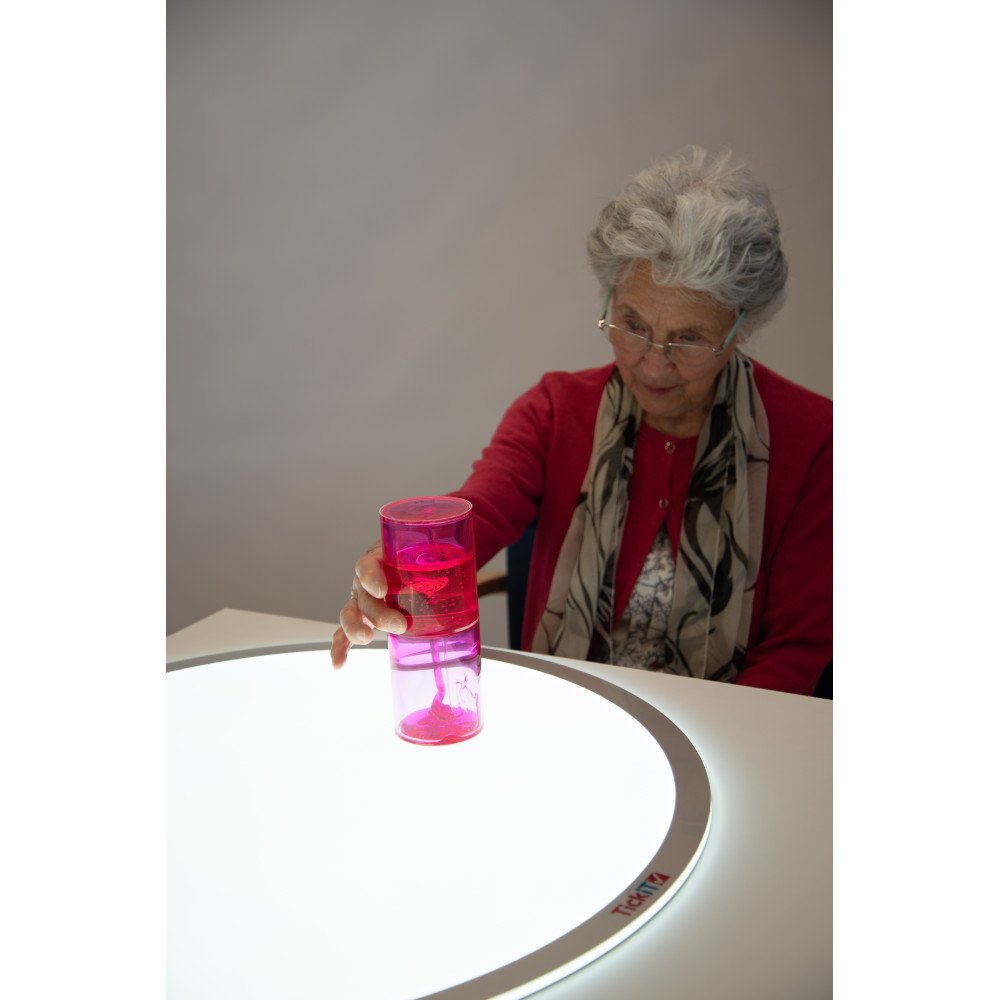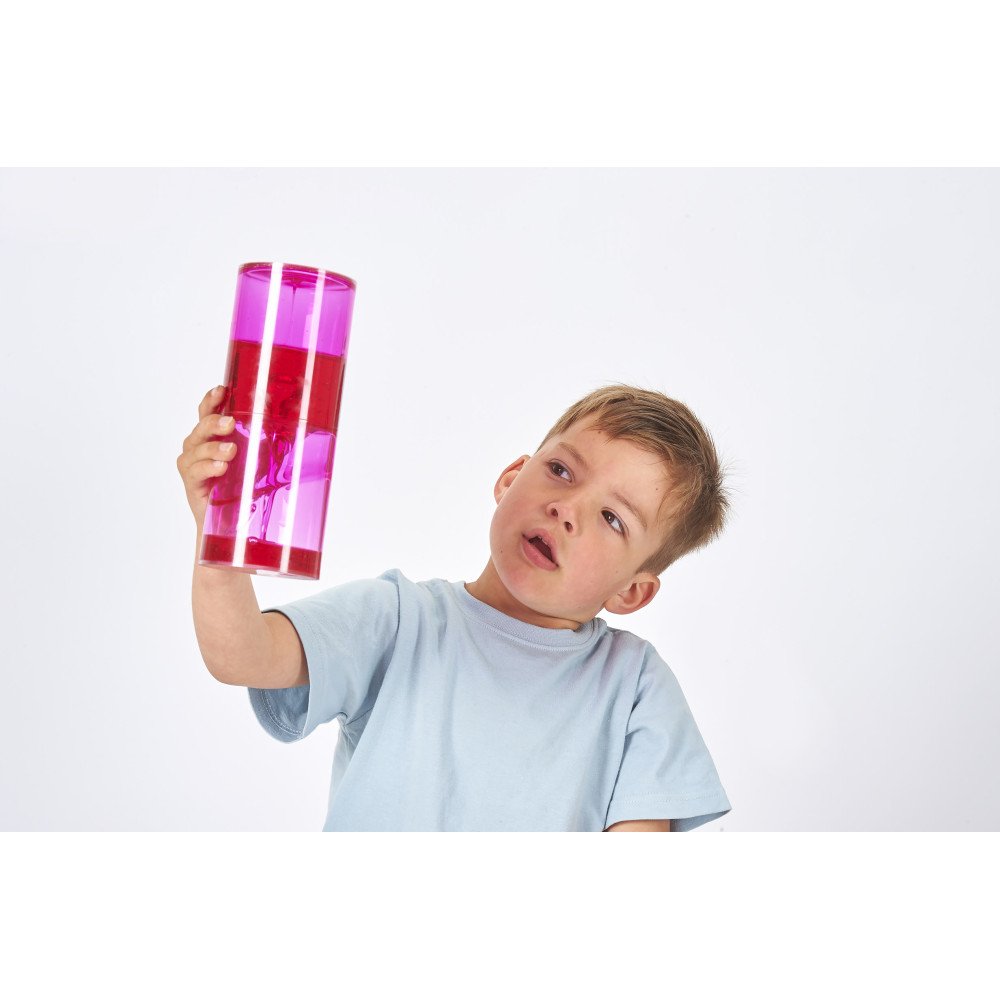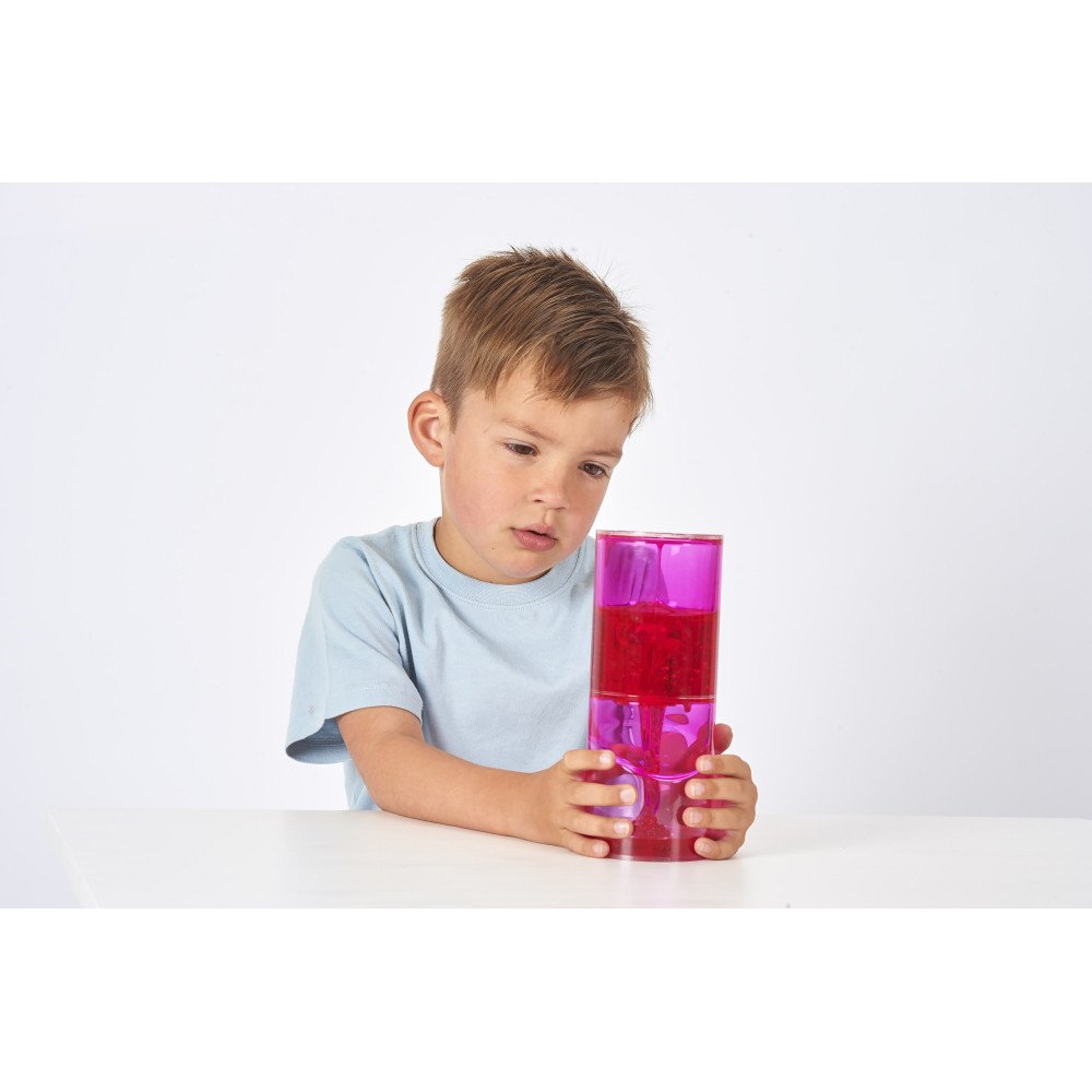 Skaidrus indas su judančiu skysčiu - krištolo skaidrumo vamzdis su tirštu, netoksišku rožiniu skysčiu, kuri lėtai teka, susisuka spirale ir vėl susikaupia apačioje. Lėtas judesys natūraliai traukia akį ir padeda vaikui sutelkti dėmesį, todėl vamzdis ypač tinka sensoriniui kambariui, nusiraminimo kampeliui ar ramioms pertraukėlėms ugdymo įstaigose. Vaikams stebint tekėjimą mažėja įtampą ir sugrįžtama į ramesnę būseną be papildomų dirgiklių.