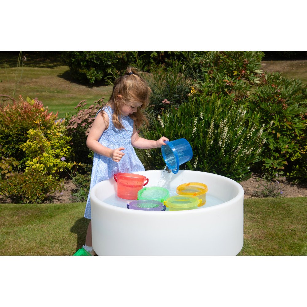 Permatomas spalvotas paviršius suteikia veiklai daugiau aiškumo ir vizualinio patrauklumo. Kibirėliai tinka Montessori veikloms, sensoriniam ugdymui, gamtos pažinimui, šviesos stalo veikloms ir grupiniams žaidimams, kai vaikai mokosi veikti savarankiškai ar kartu. Juos galima derinti su piltuvėliais ir ąsotėliais kuriant įvairesnes STEAM ir tyrinėjimo užduotis.