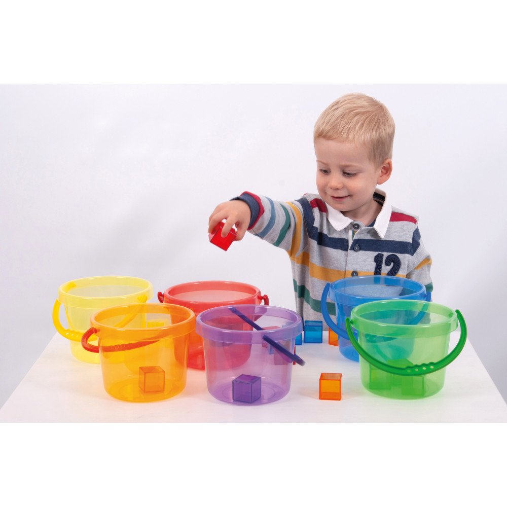 Skaidrūs spalvoti kibirėliai padeda vaikams rūšiuoti, pernešti ir lyginti įvairias medžiagas ankstyvojo ugdymo ir sensorinio tyrinėjimo veiklose. Tai universali priemonė, kuri tinka ne tik vandens ar smėlio žaidimams, bet ir kasdienėms spalvų pažinimo, rūšiavimo bei praktinio veikimo užduotims.