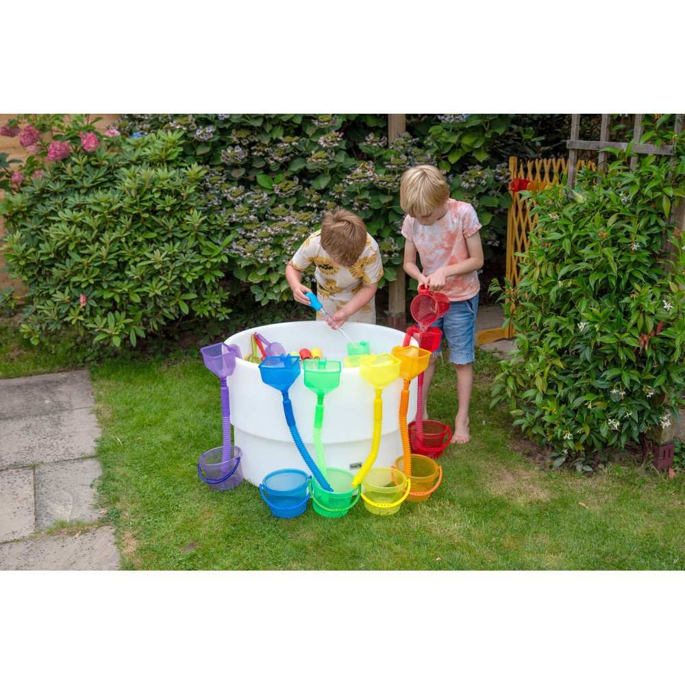 Šis tyrinėjimo rinkinys leidžia vaikams per praktinę veiklą pažinti vandens tekėjimą, kiekio ir tūrio skirtumus, pylimo kryptį, medžiagų savybes ir pirmuosius priežasties bei pasekmės ryšius. Kibirėliai, ąsotėliai, piltuvėliai, matavimo indeliai, pipetės ir lankstūs vamzdeliai suteikia daug galimybių semti, perpilti, lašinti, lyginti ir stebėti rezultatą. Tokios veiklos ypač naudingos ankstyvajam ugdymui, Montessori veikloms, sensorinei integracijai, kalbos ugdymui ir smulkiosios motorikos lavinimui.
