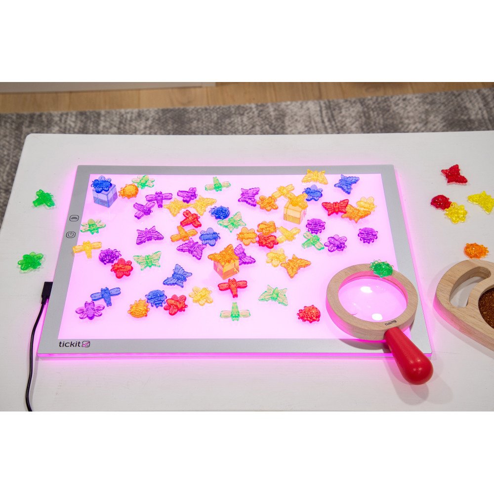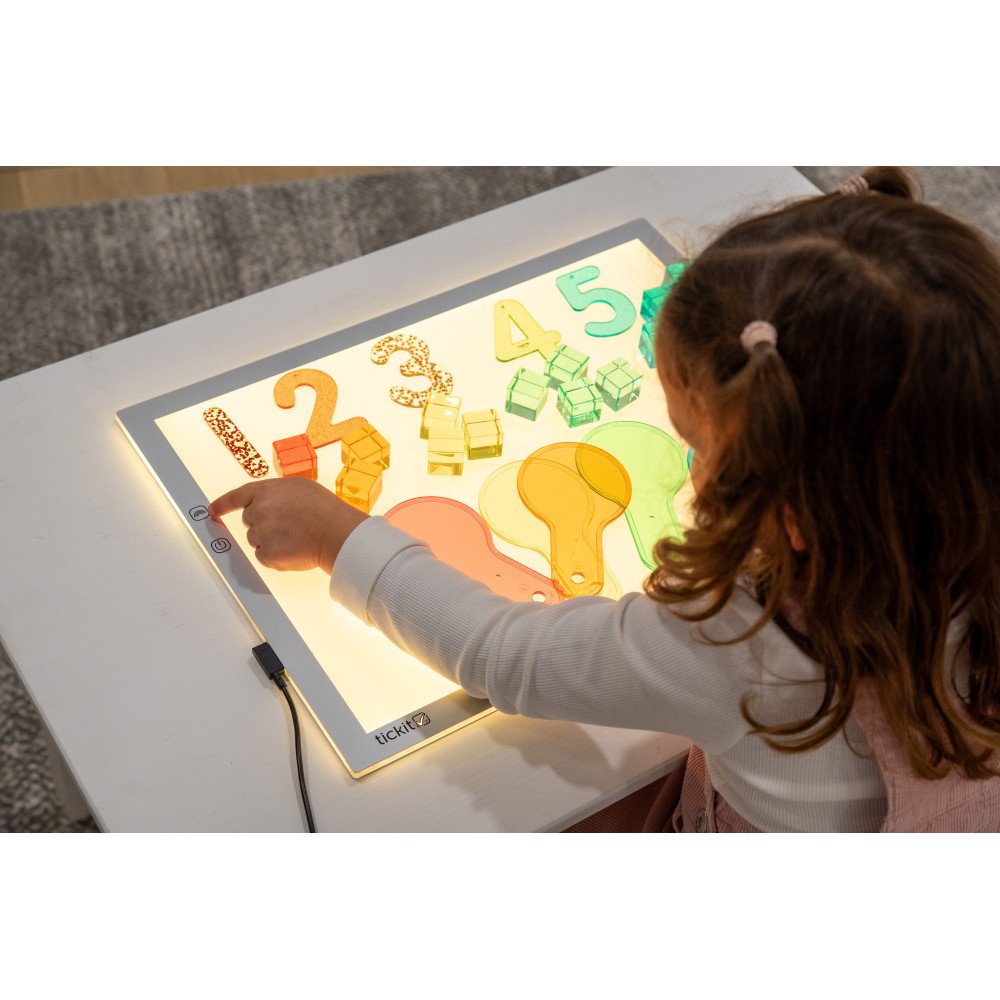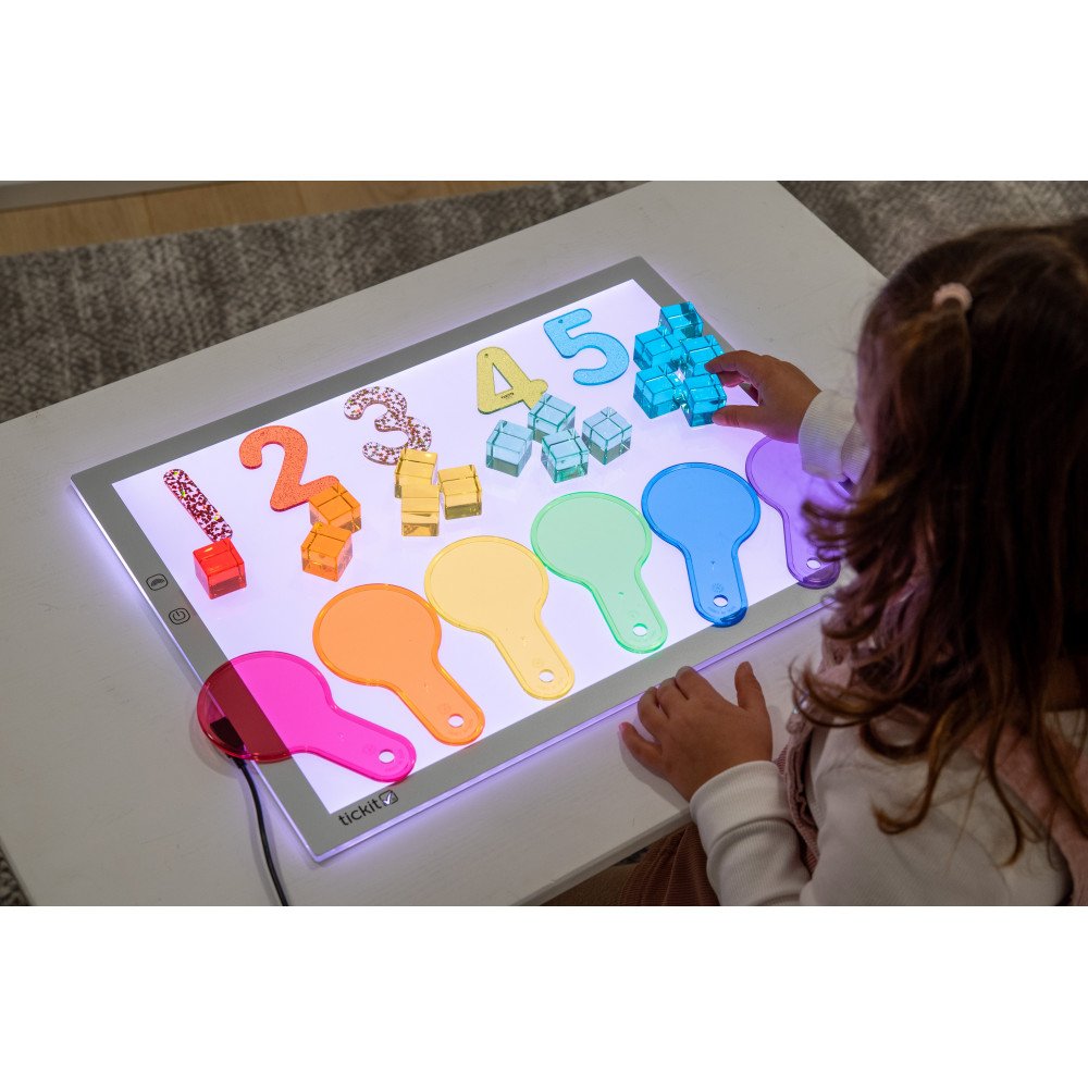 Naudojant integruotą valdymo mygtuką, vaikai gali lengvai perjungti 8 spalvas (įskaitant baltą) bei pasirinkti vieną iš 3 šviesos ryškumo lygių, pritaikydami apšvietimą skirtingoms veikloms. Šviesos panelis ypač tinka naudoti su permatomomis detalėmis, geometrinėmis formomis, sensorinėmis medžiagomis, spalvų maišymo ir dėliojimo užduotimis.