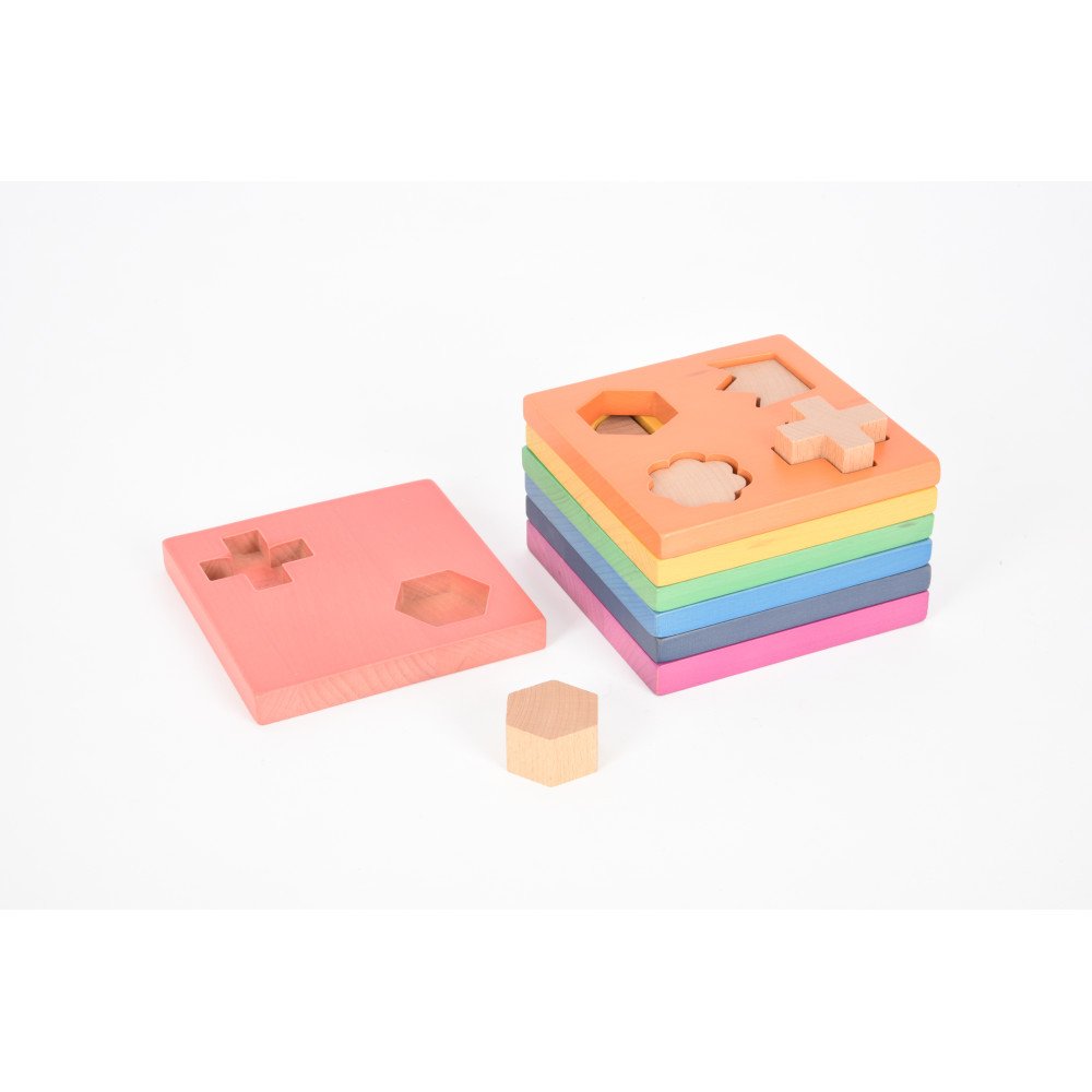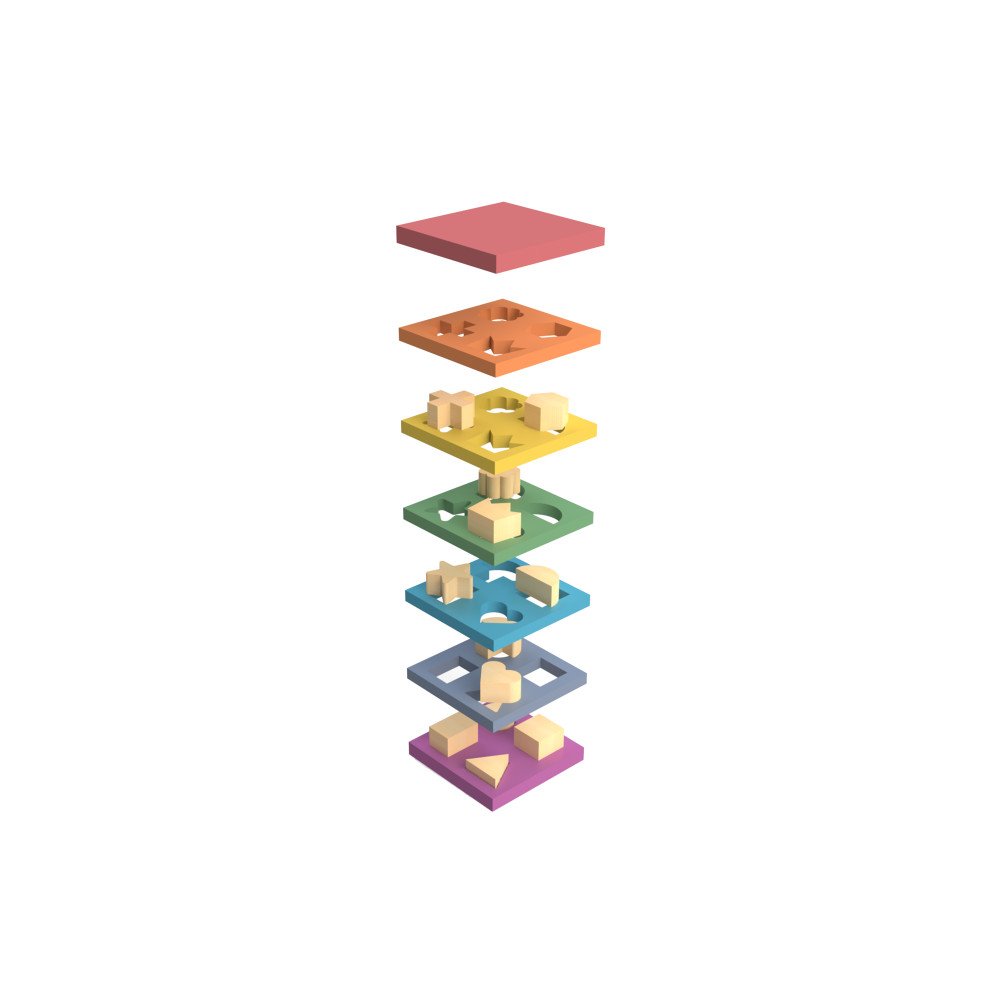 Ergoterapinė medinė dėlionė, sudaryta iš 7 spalvotų sluoksnių, kviečia vaiką ieškoti, kuri forma tinka į atitinkamą angą, o sudėjus visas dalis sukurti spalvingą bokštą. Žaidžiant lavinamas formų atpažinimas, jų lyginimas, problemų sprendimas, rankų ir akių koordinacija bei smulkioji motorika. Dėl aiškių spalvų ir skirtingų formų priemonė tinka ankstyvajam ugdymui, Montessori veikloms ir kasdienėms pažinimo užduotims namuose ar ugdymo įstaigose.