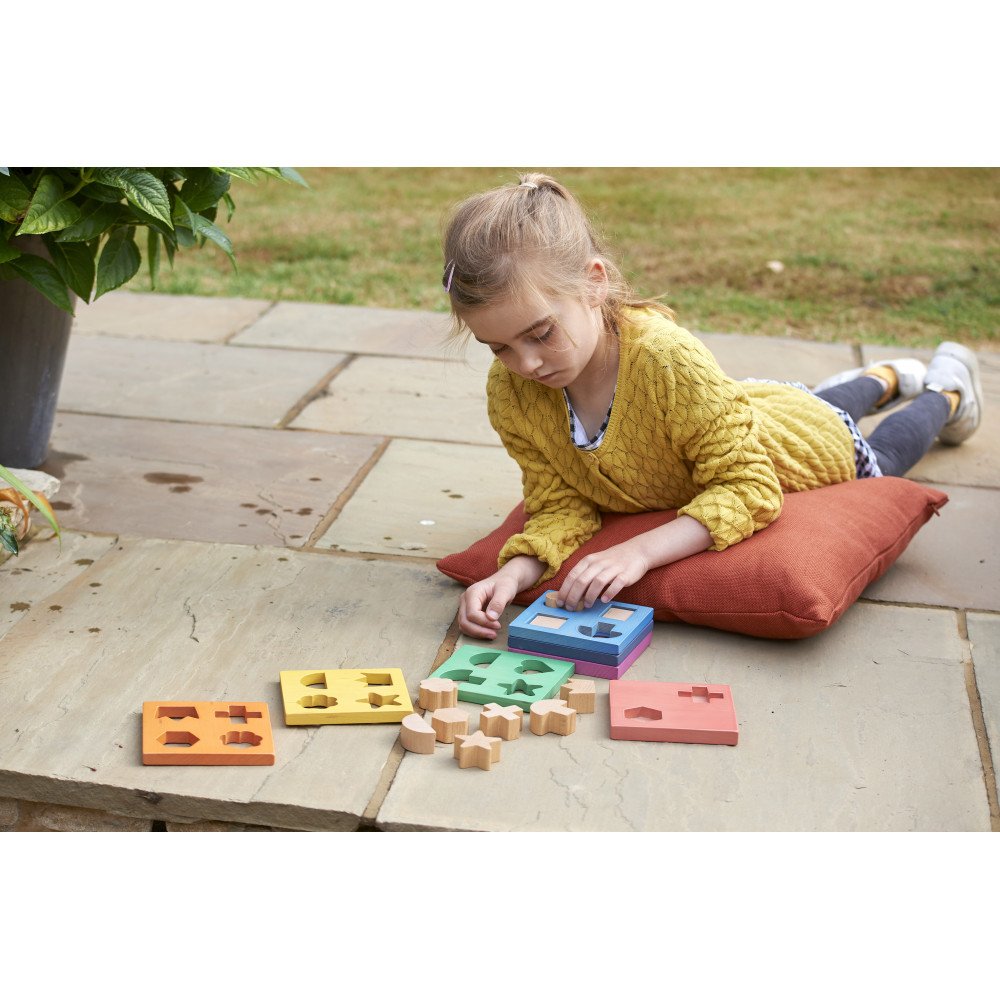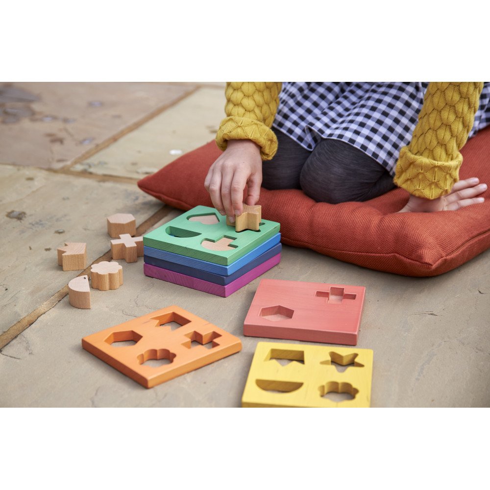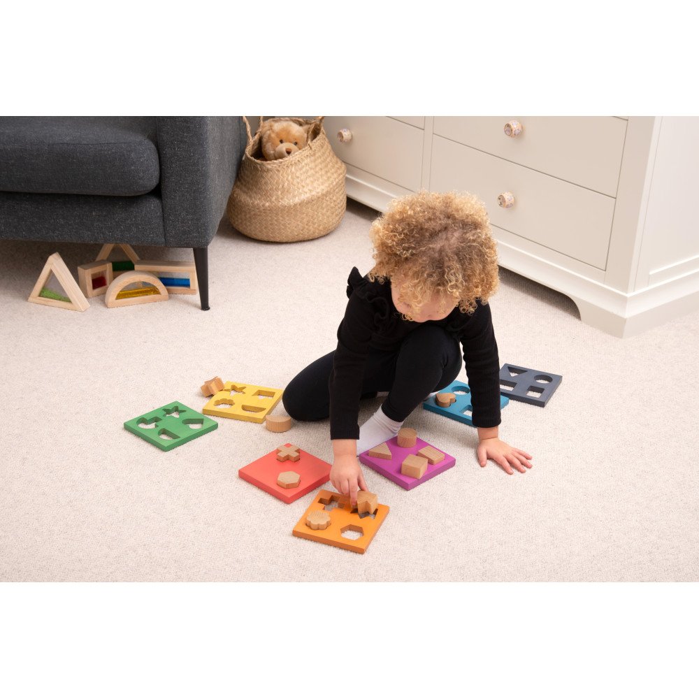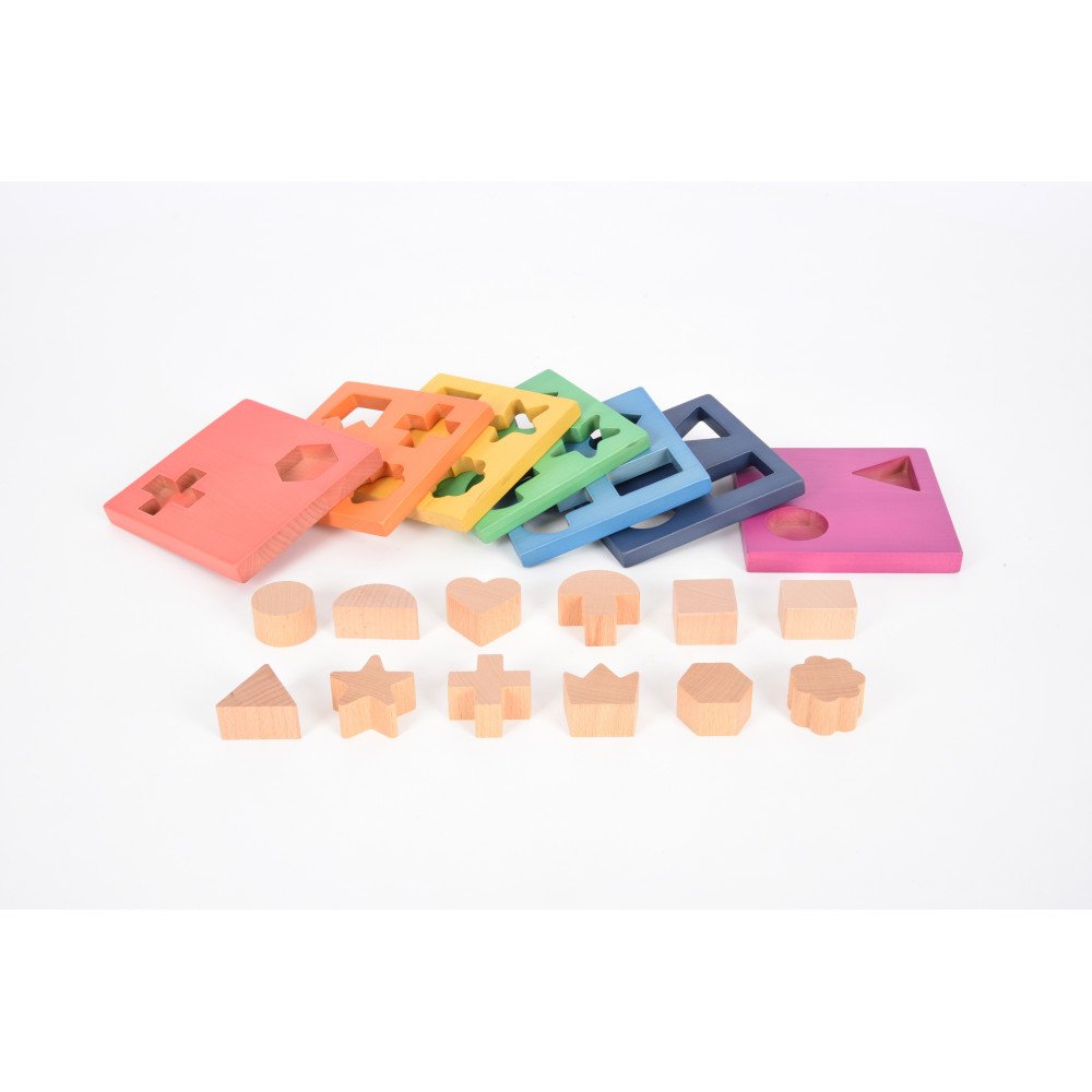 • Rinkinį sudaro 7 spalvotos medinės plokštės ir 12 stambių medinių formų.