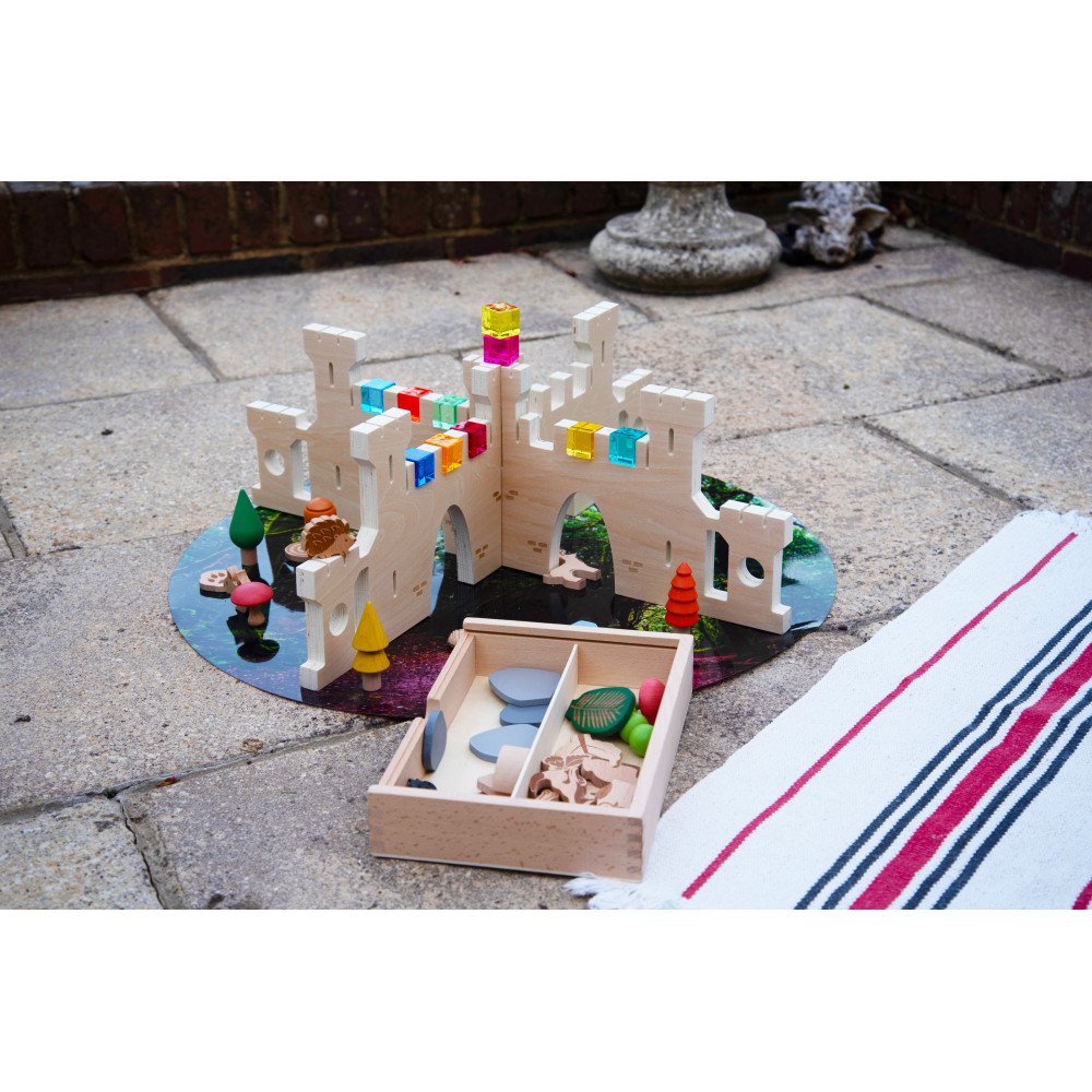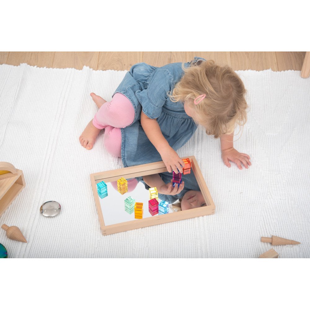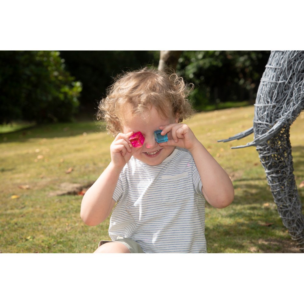 Permatomas akrilas gražiai praleidžia šviesą: kubeliai spindi saulėje ar ant LED šviesos panelės, o vidiniai atspindžiai sukuria ypatingą vizualinį efektą. Tai natūraliai kviečia vaikus tyrinėti spalvas, stebėti šviesos lūžį, bandyti spalvų persidengimą ir atrasti, kaip keičiasi atspalviai, kai detalės dedamos greta ar viena ant kitos.