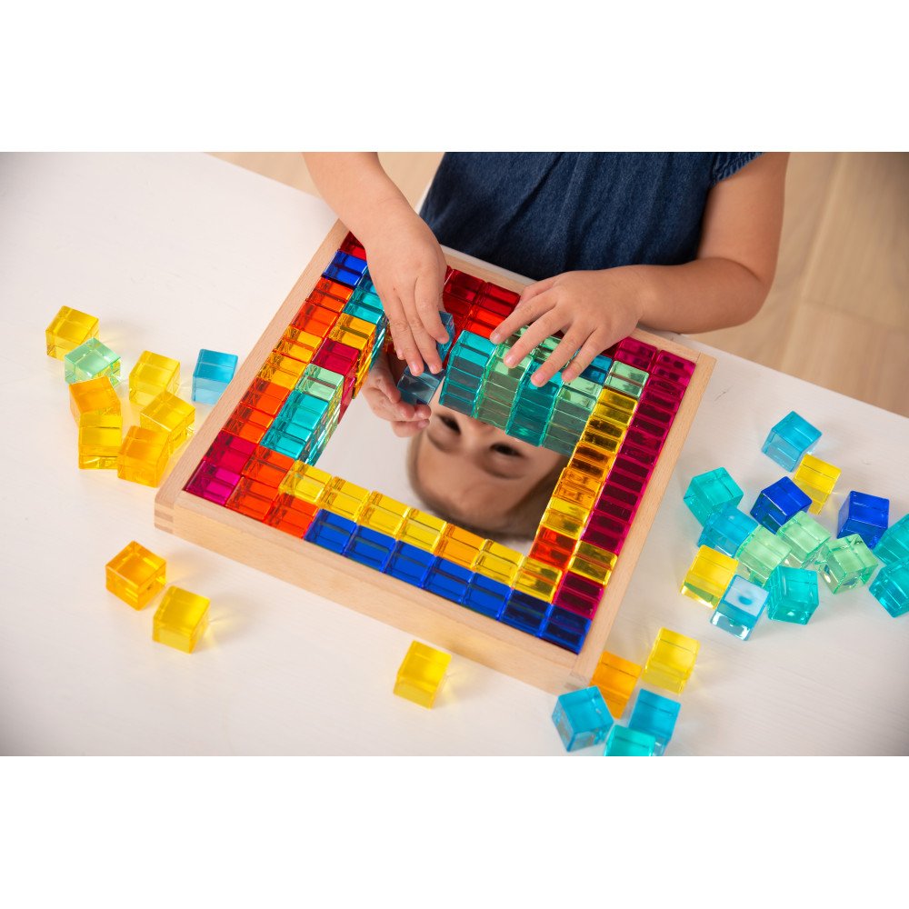 Sensorinio rinkinio išskirtinumas – tvirtas medinis padėklas su saugiu veidrodiniu pagrindu. Veidrodis atspindi šviesą atgal per kubelius, todėl spalvos tampa dar sodresnės, o vizualinis efektas – itin ryškus. Tai sukuria įtraukią erdvę tyrinėjimui: vaikai stebi atspindžius, šviesos žaismą, spalvų persidengimą, kuria raštus ir kompozicijas. Rinkinys ypač tinka naudoti ant šviesos stalo ar LED panelės, tačiau puikiai veikia ir ant įprasto stalviršio.
