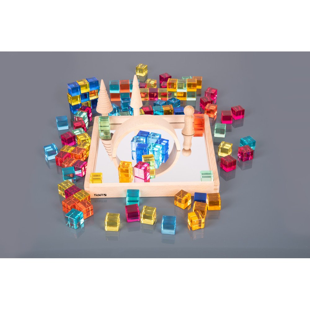 Spalvotų permatomų kubelių rinkinys su veidrodiniu mediniu padėklu – tai įspūdinga, ryški ir labai universali priemonė kūrybinėms bei ugdomosioms veikloms. Rinkinį sudaro 100 vienodo dydžio permatomų kubelių iš tvirto, skirtingų spalvų akrilo. Kubeliai turi glotnius kraštus, yra malonūs laikyti rankose ir sutrenkti kartu skleidžia švelnų, sensorinį garsą, kuris vaikams itin patrauklus.