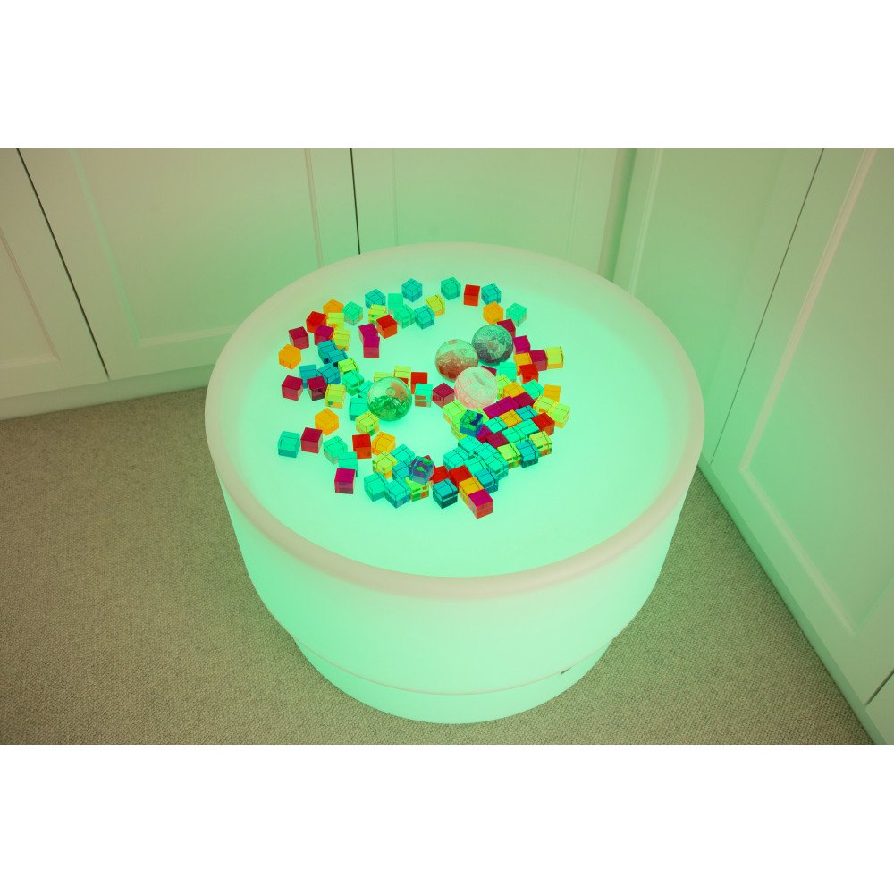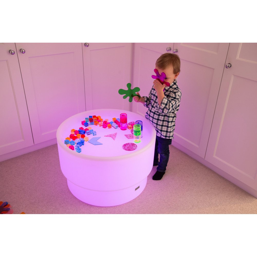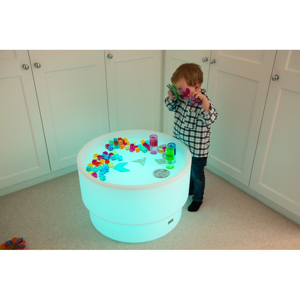 Stalas šviečia švelnia spalvota arba balta šviesa, kuri valdoma nuotolinio valdymo pulteliu. Keičiamos spalvos išryškina medžiagų struktūrą, spalvų persidengimą ir formų kontūrus, todėl veiklos tampa vizualiai aiškesnės ir labiau įtraukiančios. Apvalus dizainas leidžia patogiai prieiti iš visų pusių, todėl stalas puikiai tinka tiek individualiam susikaupimui, tiek bendroms veikloms mažose grupėse.
