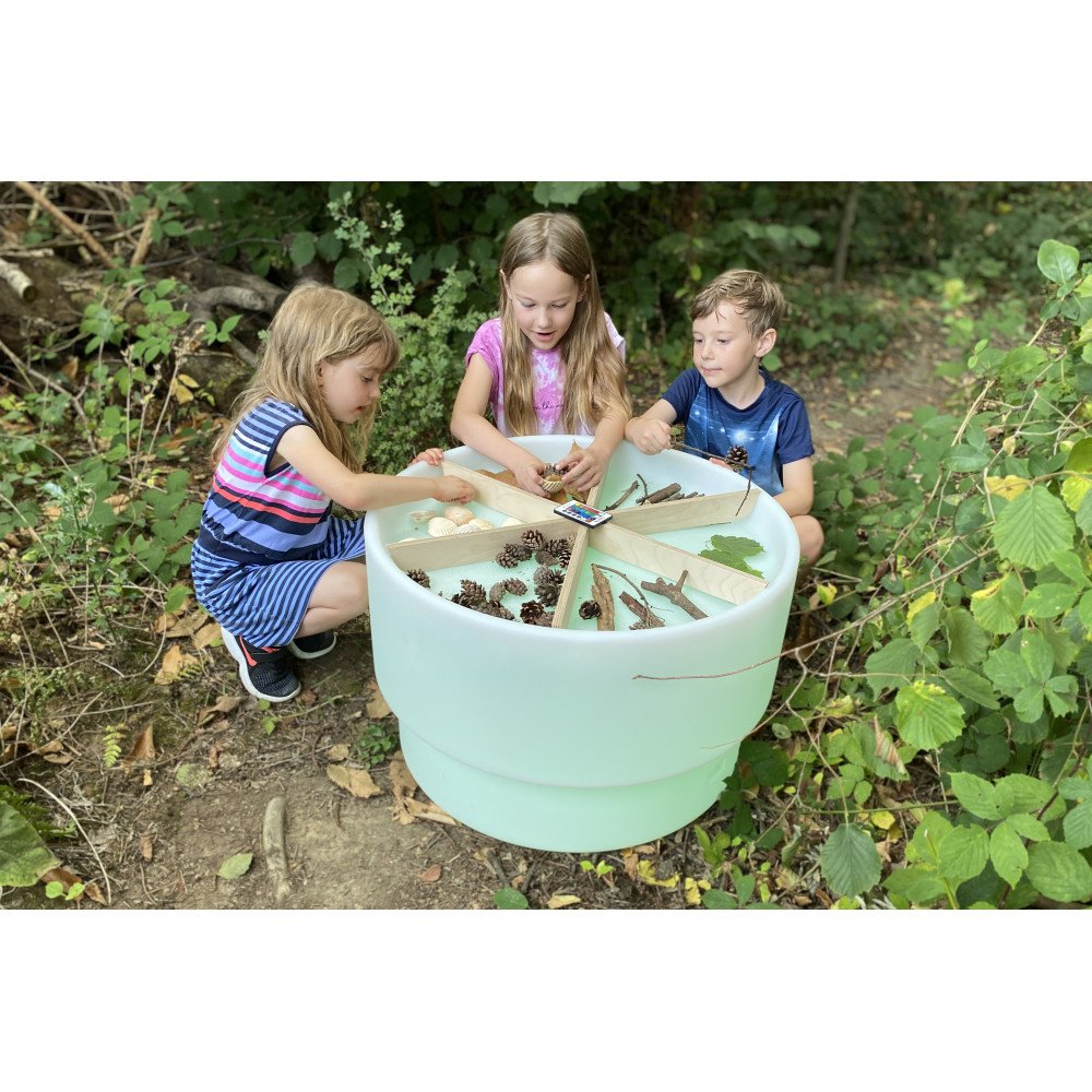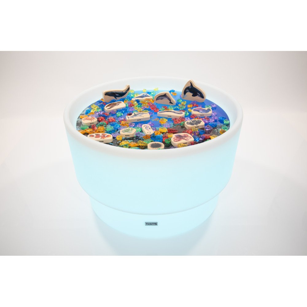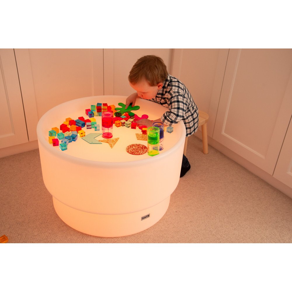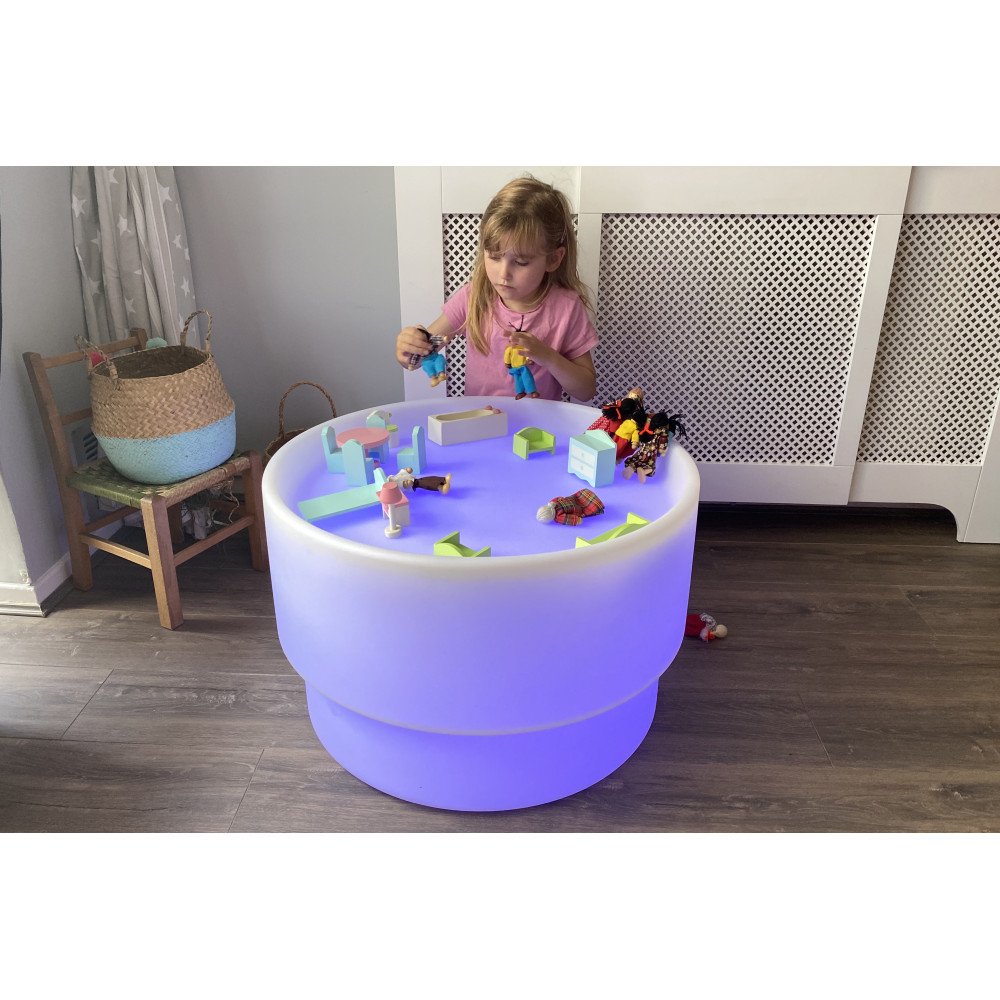 Stalas šviečia švelnia spalvota arba balta šviesa, kuri valdoma nuotolinio valdymo pulteliu. Keičiamos spalvos išryškina medžiagų struktūrą, spalvų persidengimą ir formų kontūrus, todėl veiklos tampa vizualiai aiškesnės ir labiau įtraukiančios. Apvalus dizainas leidžia patogiai prieiti iš visų pusių, todėl stalas puikiai tinka tiek individualiam susikaupimui, tiek bendroms veikloms mažose grupėse.