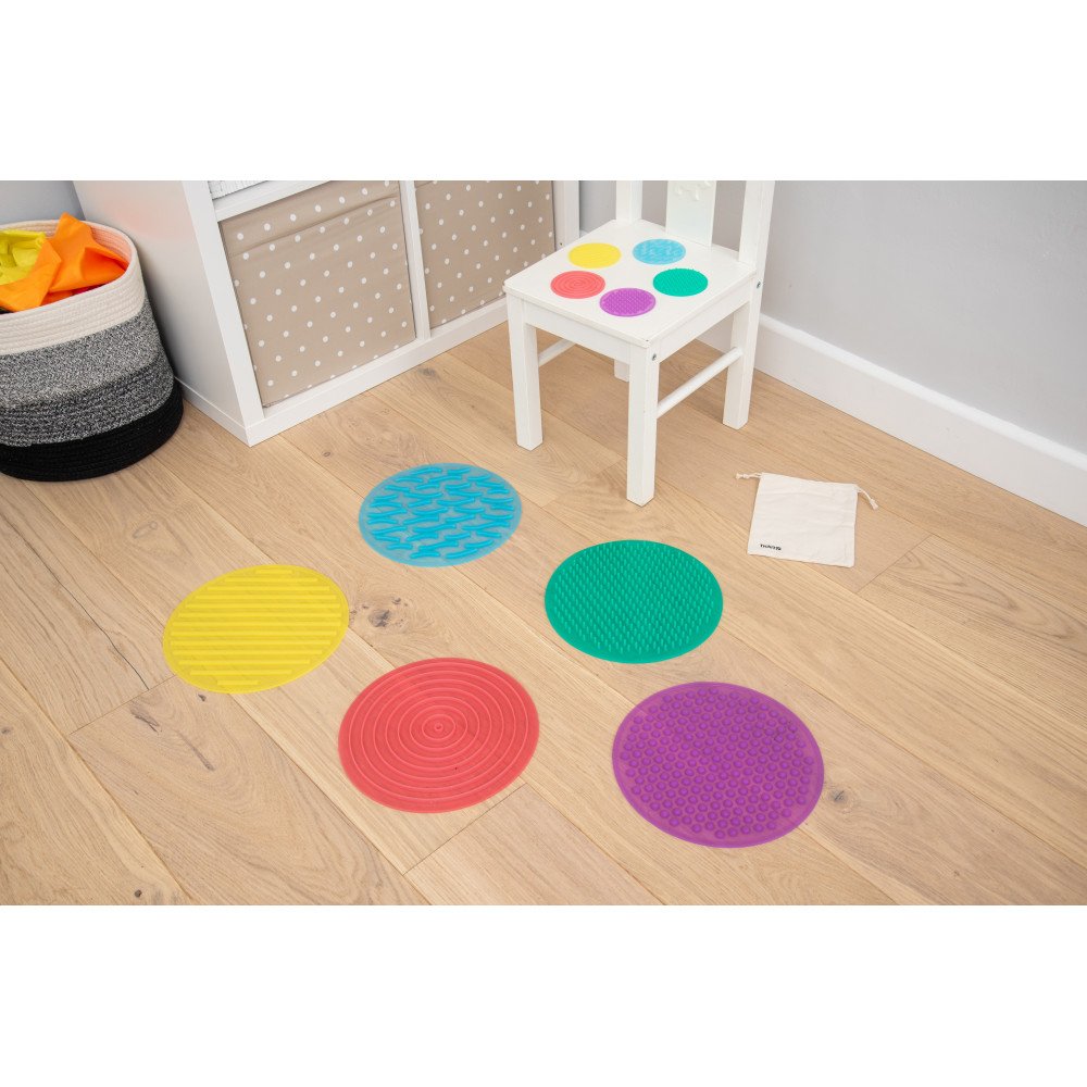 Rinkinys tinka įvairioms užduotims: liečiant, spėjant tekstūrą maišelyje, poruojant pagal pojūtį ar vaikštant per didžiuosius apskritimus. Tokios veiklos padeda stiprinti dėmesio sutelkimą, kūno koordinaciją, pusiausvyrą ir jutiminį pastabumą. Priemonė naudinga specialiųjų poreikių vaikams, ugdymo įstaigoms, logopedams, ergoterapijai ir sensoriniam kambariui, kai ieškoma saugios, lengvai valomos ir daugkartinio naudojimo sensorinės priemonės.