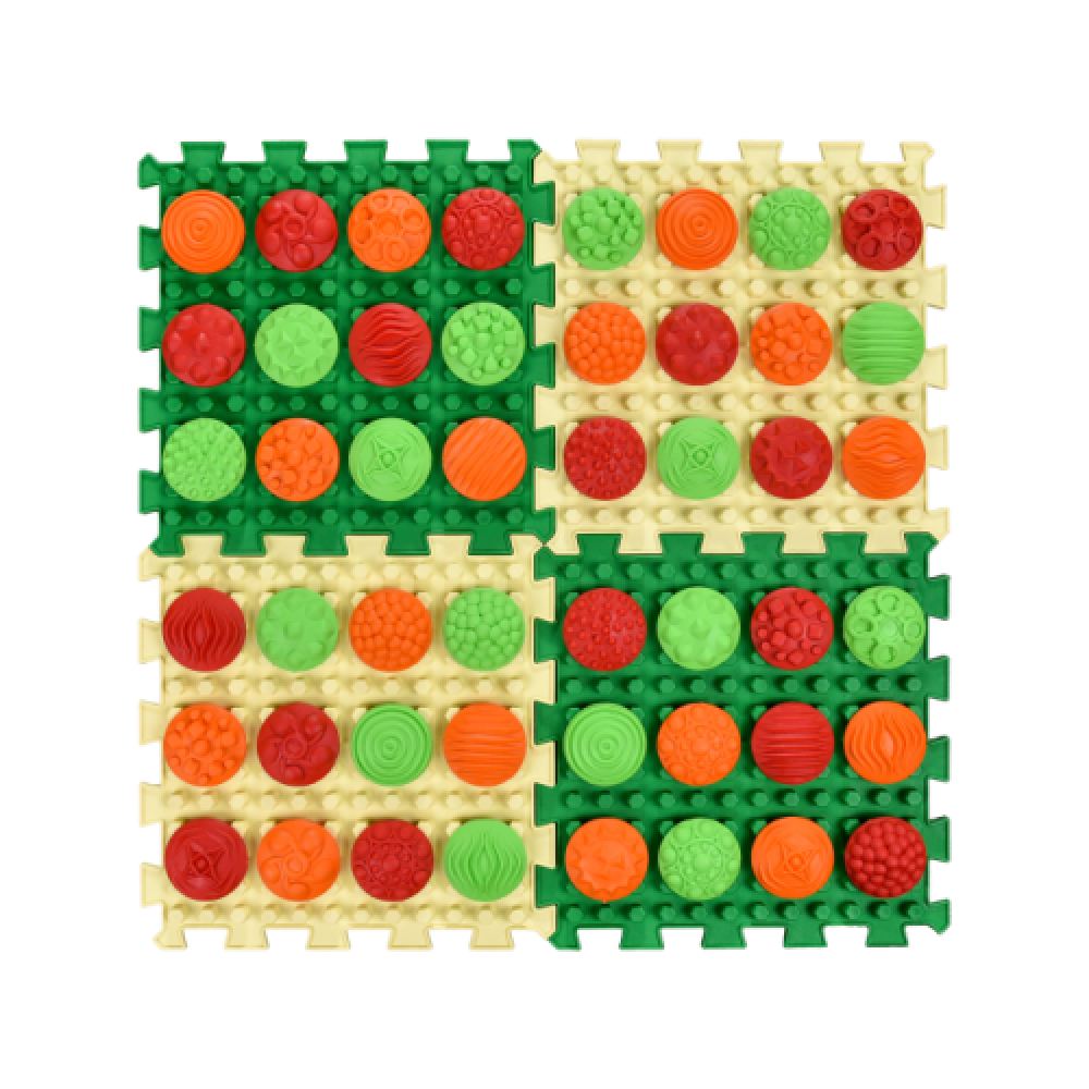 Taktilinių pojūčių kilimėlis Ortek „Raštai“ padeda lavinti pėdų jutiminį suvokimą, pusiausvyrą ir kūno kontrolę specialių poreikių vaikams. Komplektą sudaro 4 kvadratiniai kilimėliai ir net 48 taktiliniai diskai, kuriuos vaikai gali pritvirtinti ant kilimo iškilimų. Dėl šios konstrukcijos kilimėlis tampa ne tik taku vaikščioti basomis pėdomis, bet ir žaidybiniu užsiėmimu rankoms: vaikai gali rūšiuoti diskus pagal spalvas, kurti mozaikas, dėlioti formas, atkartoti sekas ar sukurti savo raštus. Kilimėliai yra tvirti, todėl ant jų galima saugiai vaikščioti ir gauti masažo efektą.