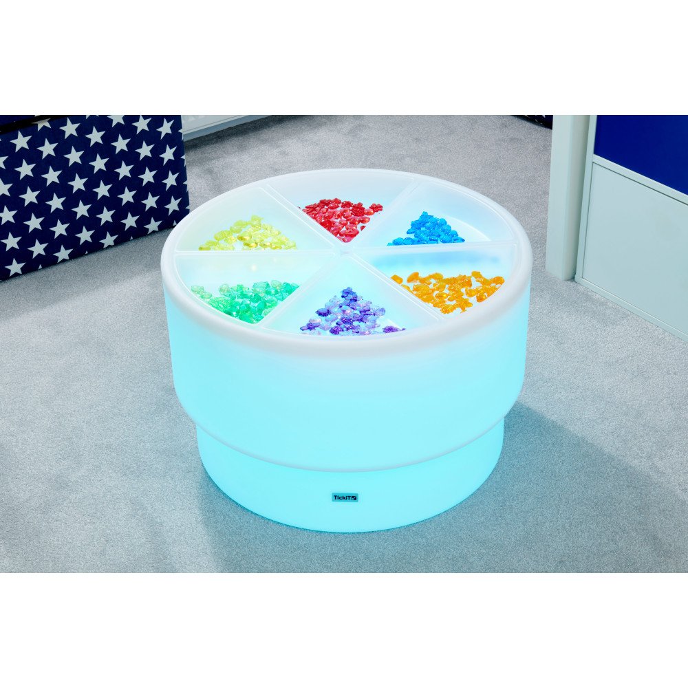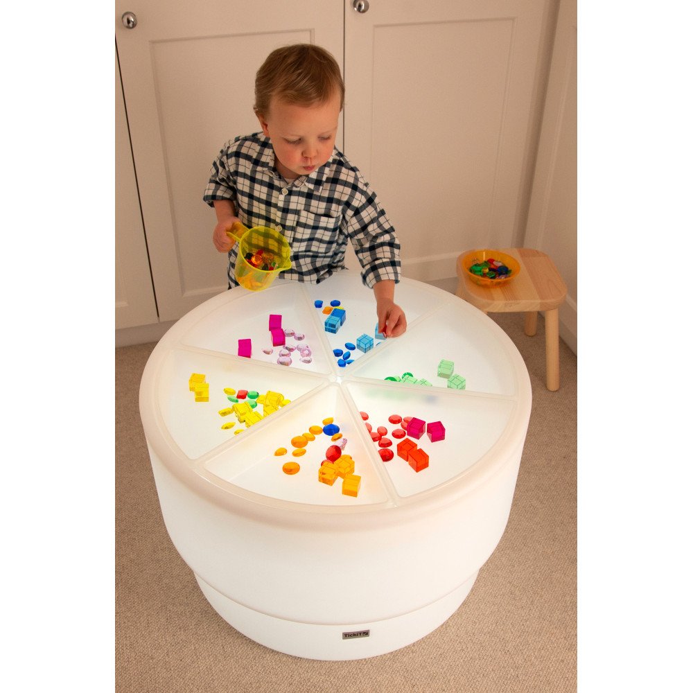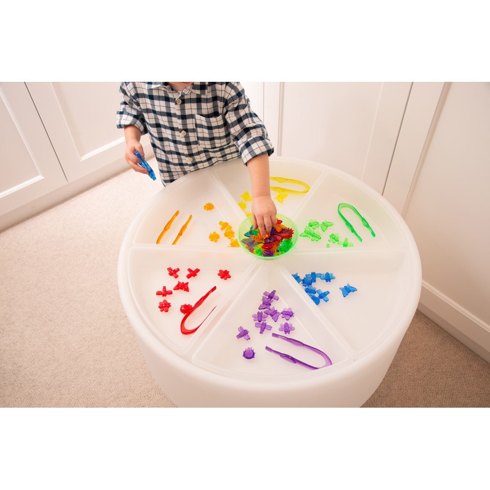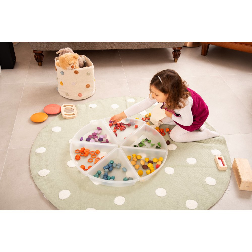 Tyrinėjimo padėklai (6 vnt.) skirti sensoriniam pasaulio pažinimui, medžiagų tyrinėjimui ir smulkiosios motorikos lavinimui. Pusiau permatomi balti padėklai tinka naudoti apvalių šviesos stalų viduje arba atskirai ant žemės ar grindų. Šios formos leidžia lengvai sukurti tvarkingas veiklas su smėliu, vandeniu, konfeti, medžio drožlėmis ar kitomis medžiagomis. Dėklai padeda vaikui patogiai semti, pilstyti, pernešti ir rūšiuoti, o tokie pasikartojantys judesiai lavina rankų miklumą ir rankų–akių koordinaciją.