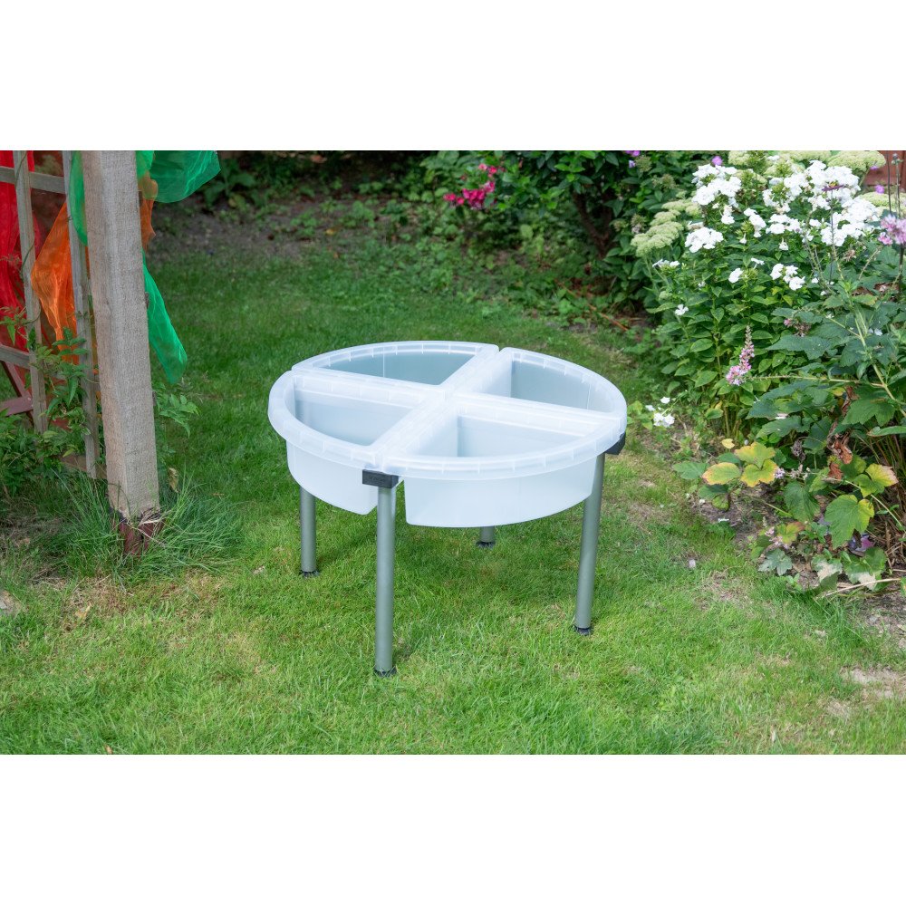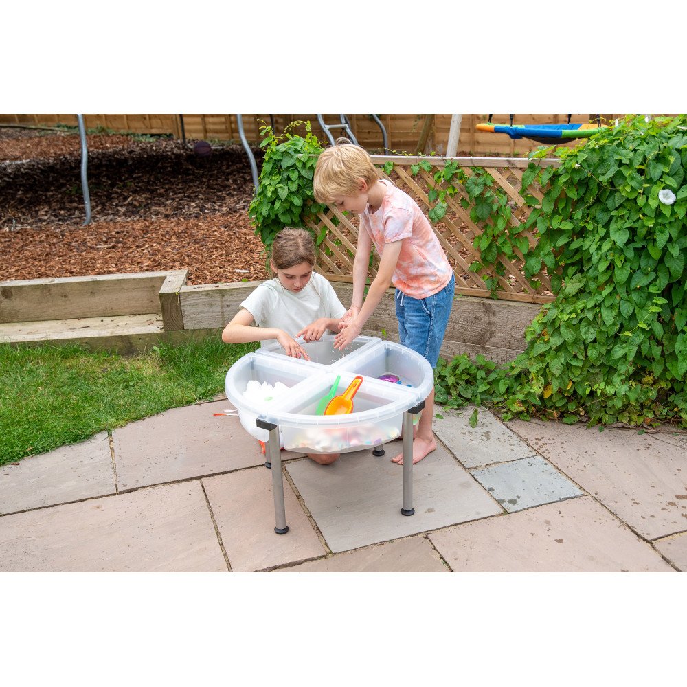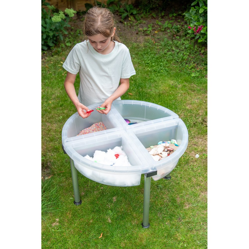 Tyrinėjimo padėklų 450 mm aukščio stovas pritaikytas vaikų ūgiui, todėl priemonės visada pasiekiamos, o veikla vyksta patogioje padėtyje. Vaikai semia, pila, rūšiuoja, perneša medžiagas ir kartu tariasi, dalijasi, laukia savo eilės bei įvardija, ką daro – taip stiprėja smulkioji motorika, komunikacija ir socialiniai įgūdžiai. Prekė tinkamai naudoti tiek patalpose, tiek lauke.