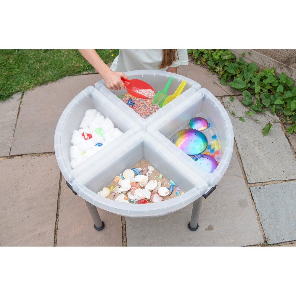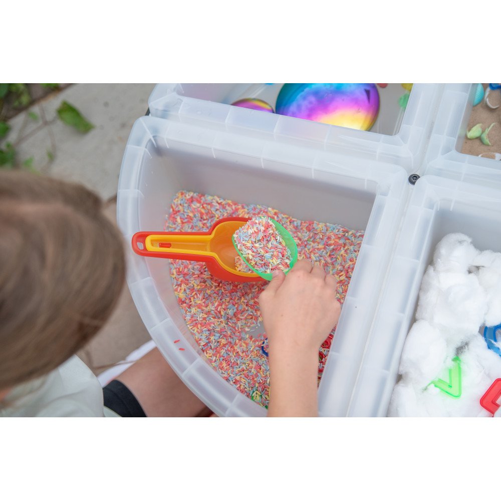 Tyrinėjimo padėklai su stovu leidžia vaikams vienu metu dalintis priemonėmis, susitarti dėl veiksmų ir mokytis bendradarbiauti per sensorines užduotis. Keturi gilūs skyriai sukuria aiškias atskirao darbovietes grupėje: vaikai gali pasiskirstyti, kiekvienas turėti savo medžiagą arba atlikti skirtingą veiklos dalį, o suaugusiajam lengviau organizuoti užduotį ir išvengti maišymosi. Tai ypač svarbu darželio grupėse ir dirbant su specialių poreikių vaikais, kai struktūra, ribos ir aiškus pasidalijimas padeda jaustis saugiau, išlaikyti dėmesį ir mažinti konfliktus dėl priemonių.
