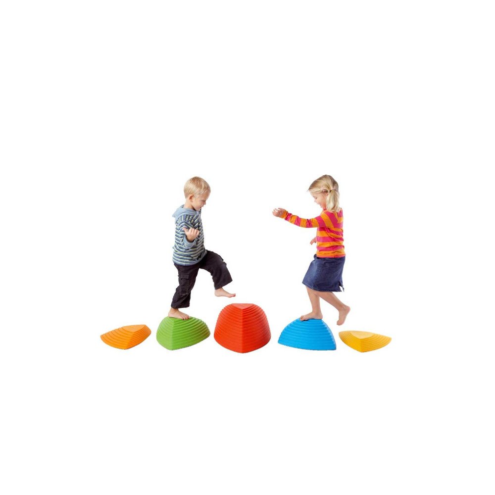 Spalvingas balansinių laiptelių rinkinys padeda lavinti vaikų pusiausvyrą, koordinaciją, stambiają motoriką ir sensorinius įgūdžius lavinti. Skirtingo aukščio akmenys leidžia vaikams šokinėti, lipti, perkelti svorį ir treniruoti judesių tikslumą. Ši veikla padeda ugdyti ne tik fizinę jėgą, bet ir erdvinį suvokimą, laikysenos kontrolę, judesių planavimą bei emocinį pasitikėjimą savimi. Aukštos kokybės plastikas ir neslystančios gumos kraštinės užtikrina stabilumą bei saugumą tiek viduje, tiek lauke, apsaugodamos grindis ir vaikus nuo slydimų. Akmenys yra lengvai sudedami vienas ant kito, todėl patogu juos laikyti.