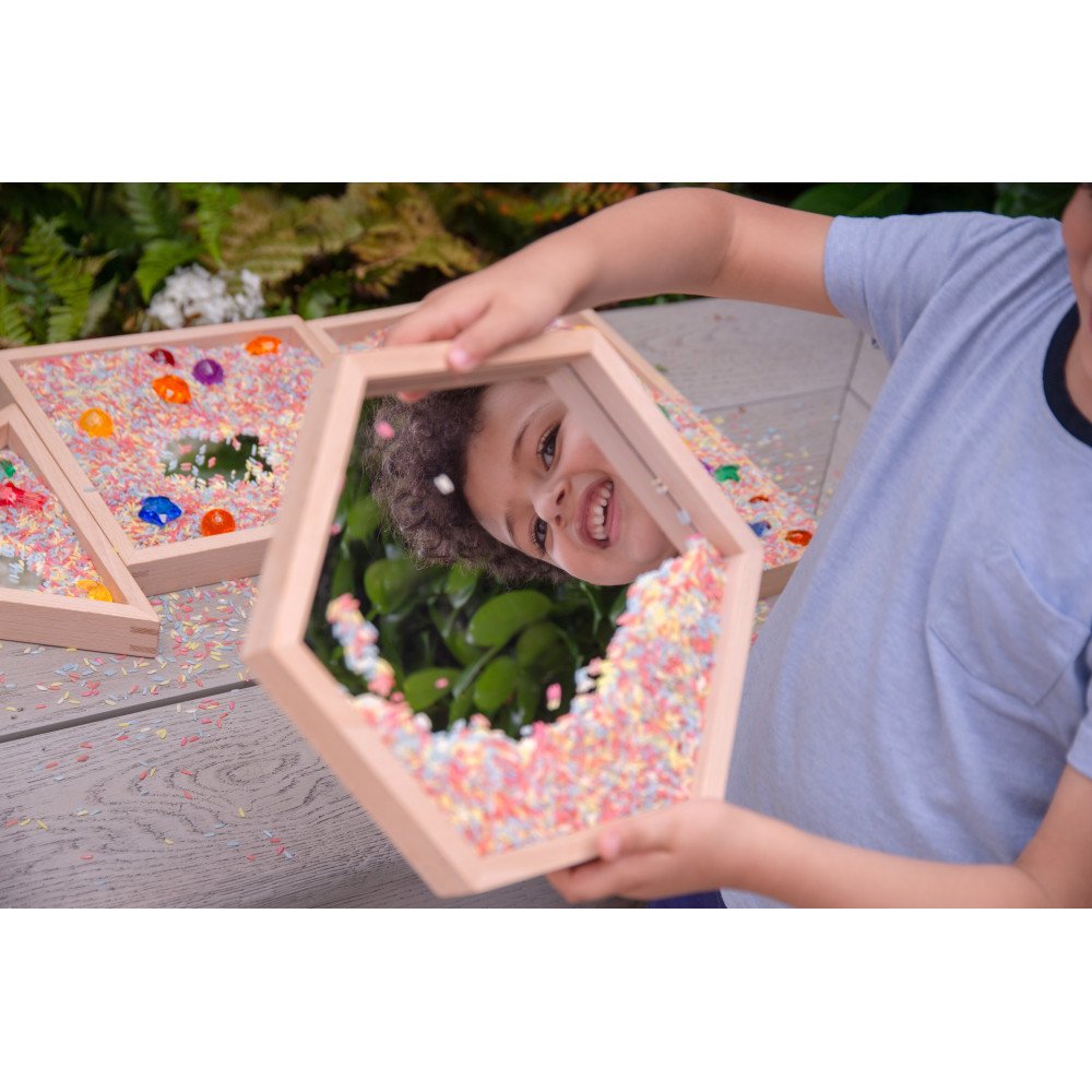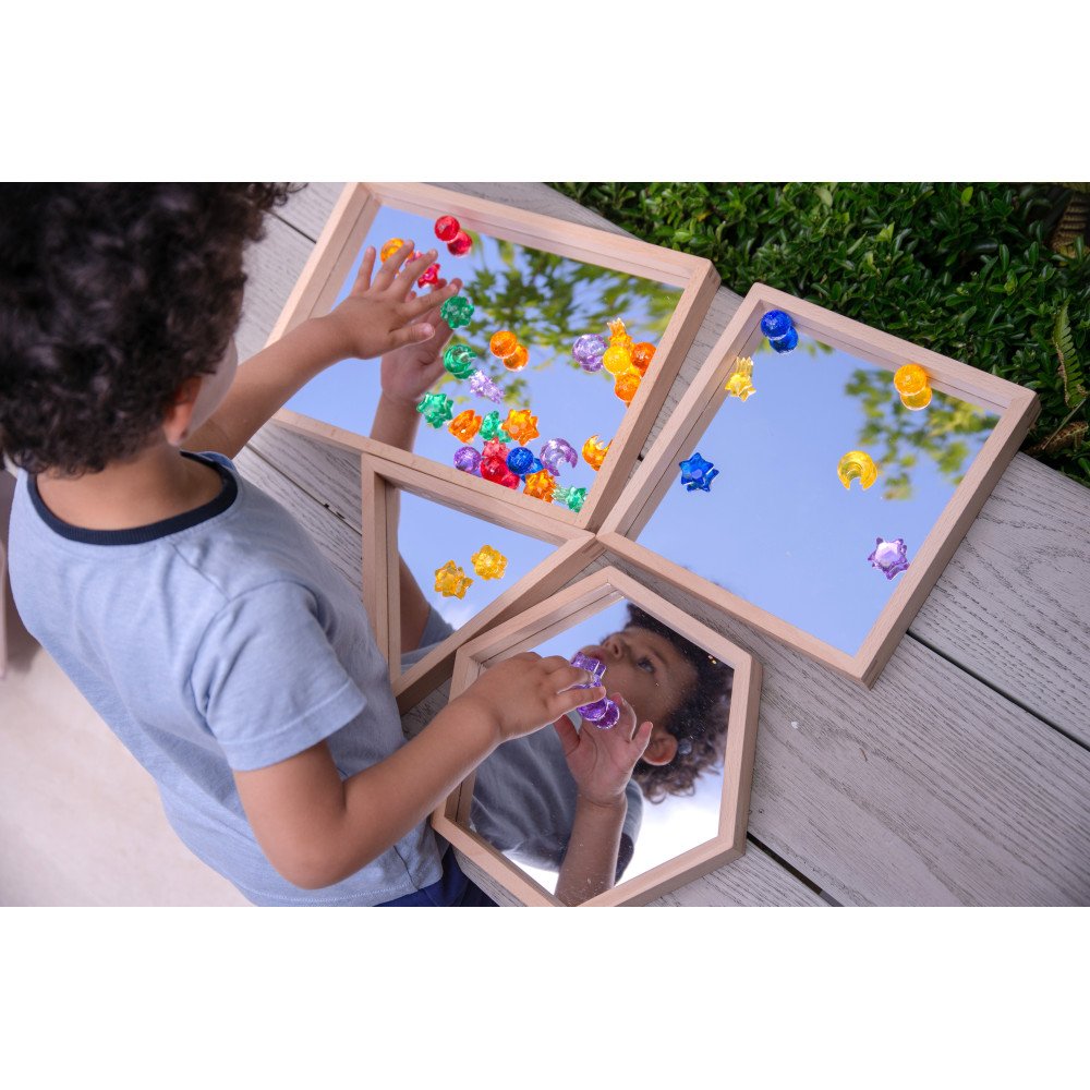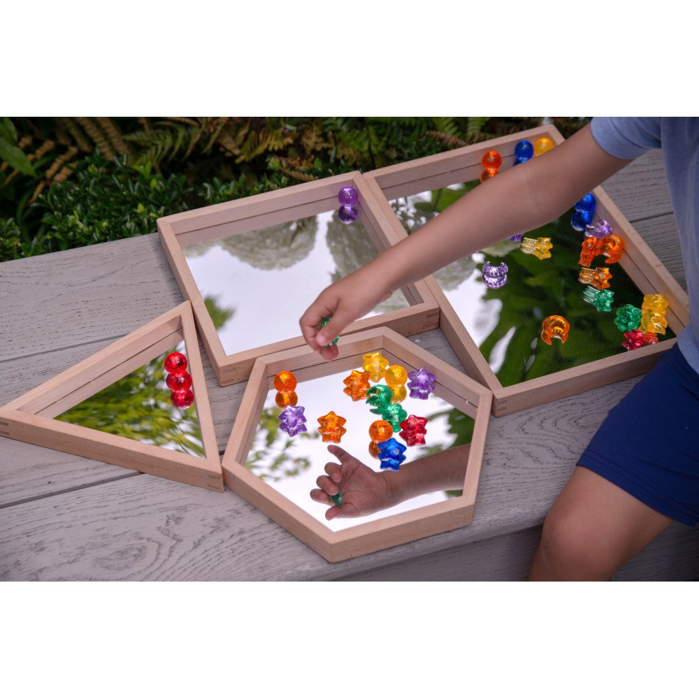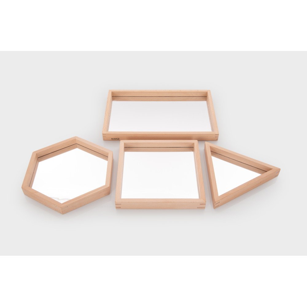 Veidrodiniai sensoriniai padėklai (4 formos) skirti atspindžių tyrinėjimui, emocijų mokymuisi ir kalbos ugdymo veikloms darželyje bei mokykloje. Rinkinyje yra keturi tvirti buko medienos padėklai su akriliniu veidrodiniu pagrindu, todėl vaikai gali saugiai stebėti savo atspindį, išbandyti veido mimikas ir tyrinėti veidrodžio efektus. Skirtingos formos (stačiakampis, šešiakampis, kvadratas, trikampis) padeda įtraukti ir matematinį mąstymą – kalbėti apie formas, simetriją, atspindį bei dėsningumus.