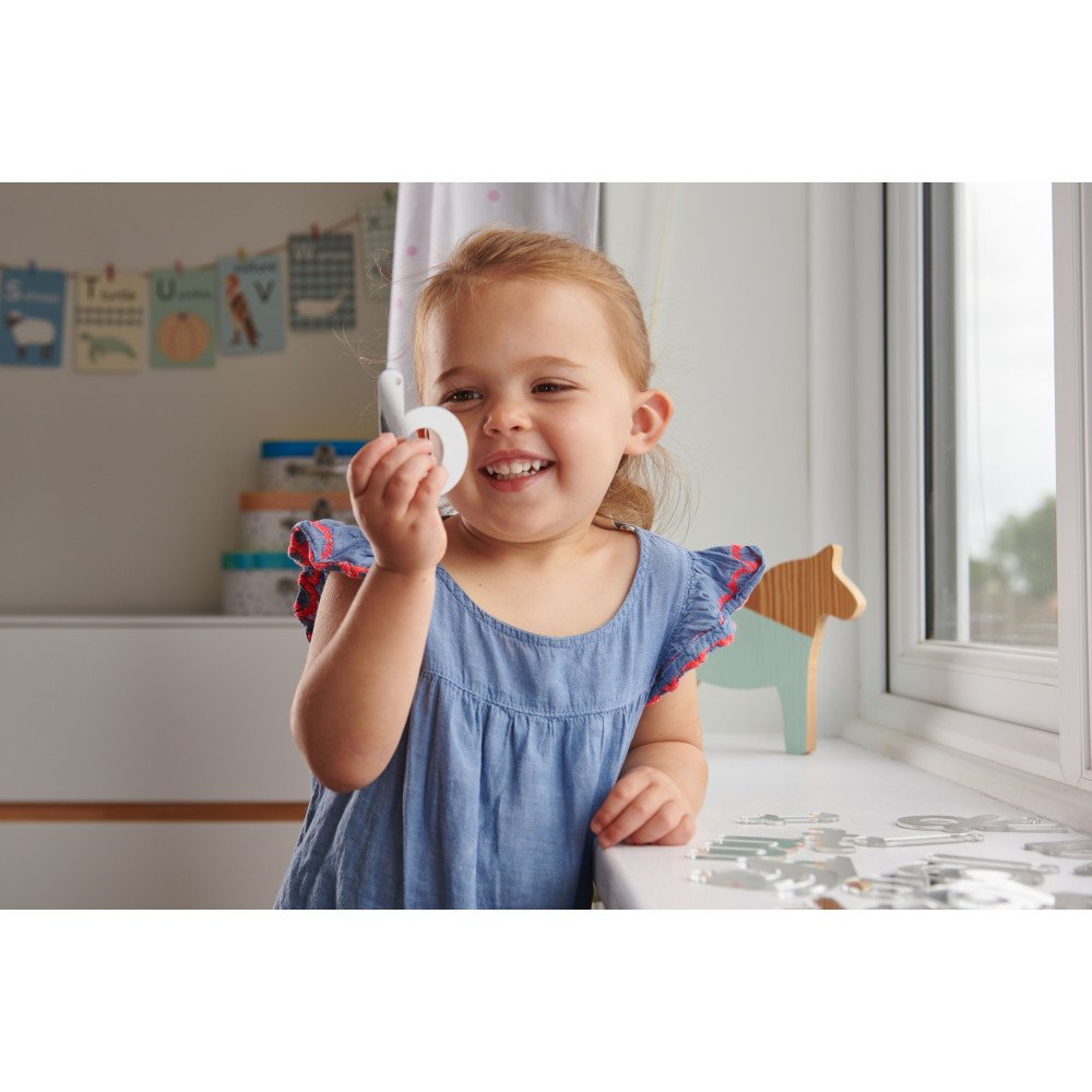 Veidrodinių raidžių rinkinys padeda vaikams atpažinti raides, mokytis abėcėlės ir lavinti smulkiąją motoriką per lytėjimą bei sekimą pirštu. Raidės yra malonios laikyti rankoje, todėl vaikas gali jas dėlioti, rūšiuoti, liesti ir apvedžioti pirštu – taip lengviau įsimenama raidės forma ir kryptys. Spindintis veidrodinis paviršius natūraliai patraukia dėmesį, todėl priemonė tinka ir vaikams, kuriems sunkiau išlaikyti susikaupimą. Tai praktiška priemonė ugdymo įstaigoms ir namų veikloms, kai norisi įtraukti raides į sensorinį žaidimą, kalbos ugdymą ir ankstyvąjį raštingumą.