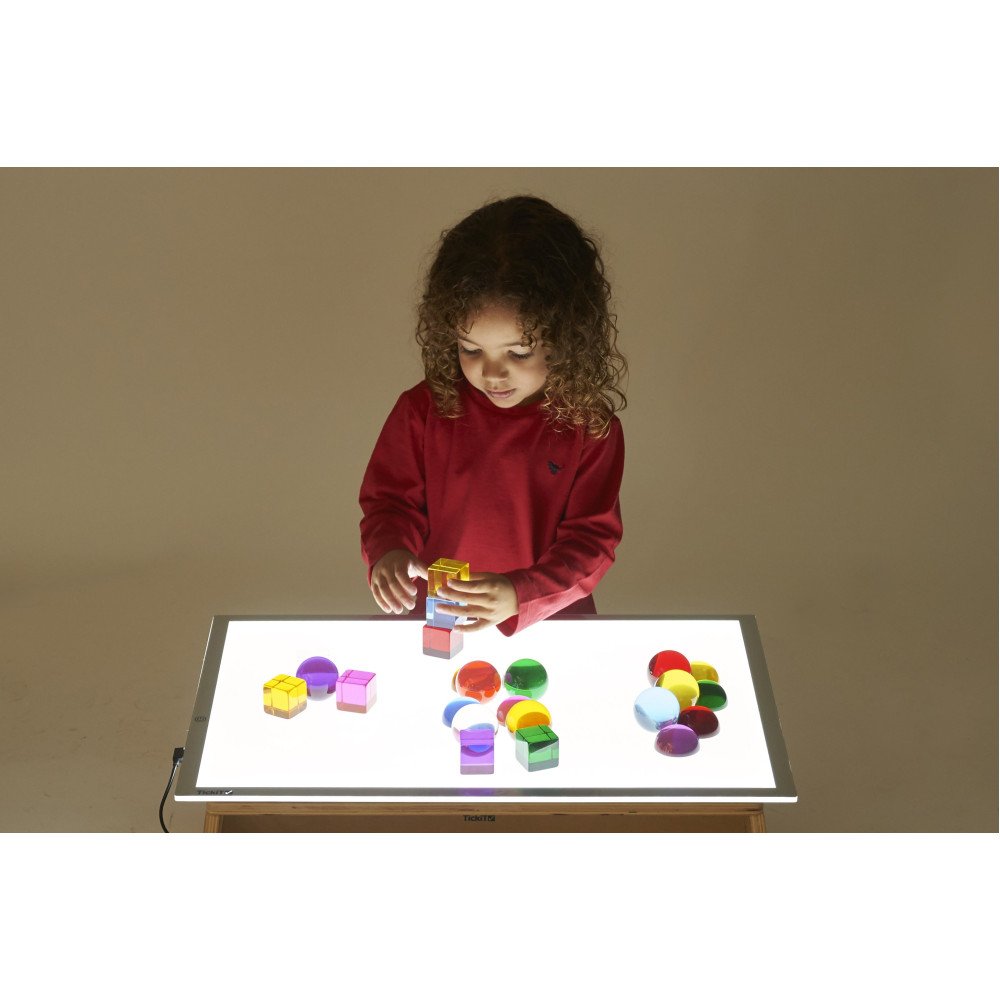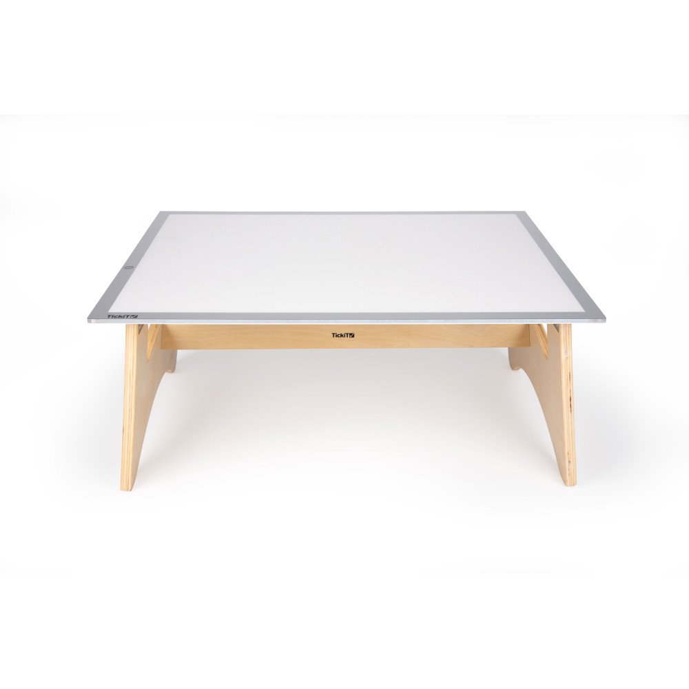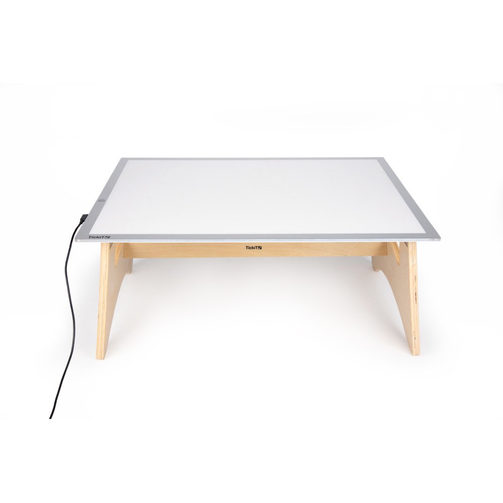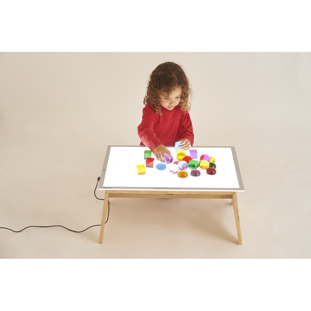 Stalas yra žemo aukščio, todėl vaikams patogu dirbti ant grindų ar sėdint šalia. Kojos išsiskleidžia ir tvirtai užsifiksuoja su šešiakampiu raktu – tai užtikrina stabilumą, o prireikus rinkinį galima greitai sulankstyti ir patogiai laikyti. Šviesos lenta pagaminta taip, kad būtų atspari kasdieniam naudojimui: plono profilio, su suapvalintais kampais, lengvai pernešama ir nuvaloma.