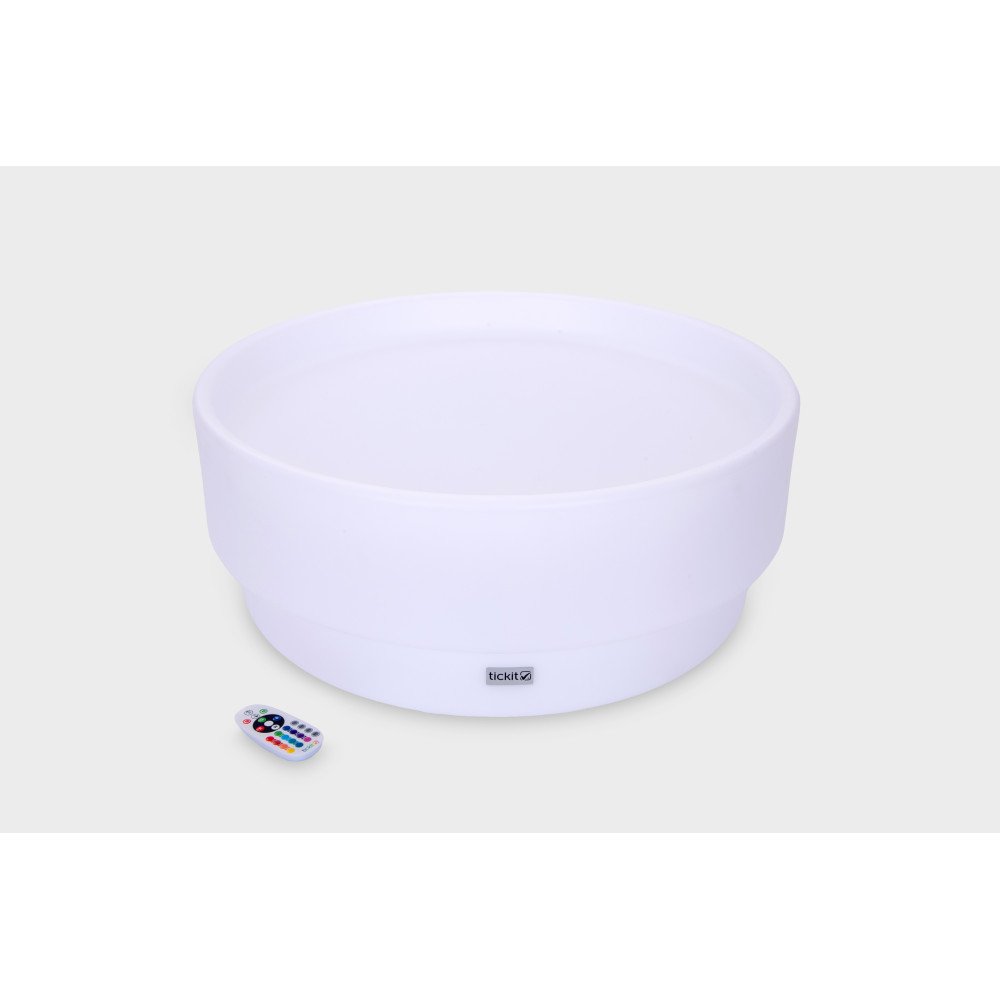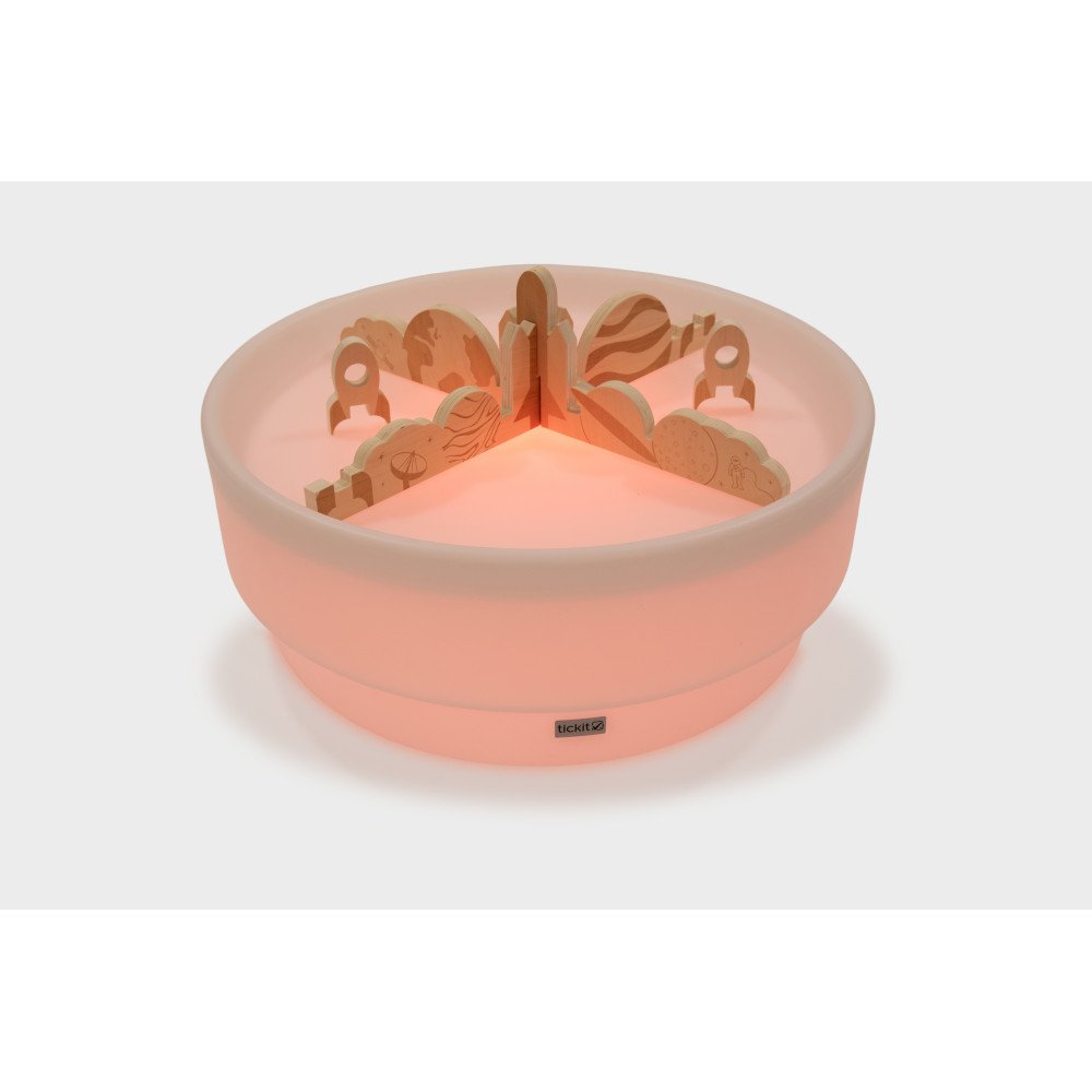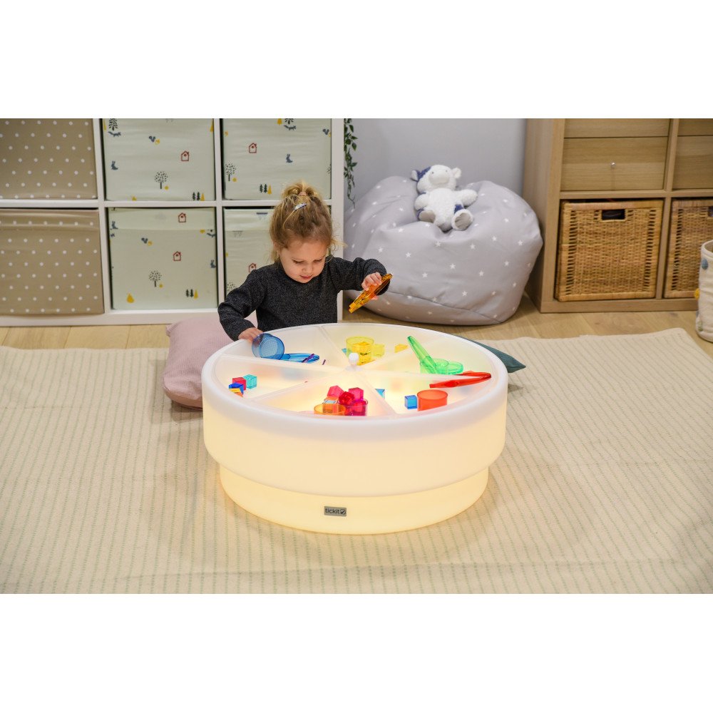 Žemas šviečiantis atradimų stalas sukurtas kūdikiams ir mažyliams, kad tyrinėjimas per pojūčius būtų patogus dar prieš vaikui pradedant stovėti. Dėl žemo aukščio vaikas gali lengvai pasiekti veiklų zoną, o apvali forma suteikia patogų priėjimą iš visų pusių, todėl stalas tinka tiek individualiams užsiėmimams, tiek bendroms veikloms su kitu vaiku ar suaugusiuoju. Stalas šviečia švelnia balta arba spalvota šviesa, todėl galima greitai keisti apšvietimą pagal veiklą ir vaiko poreikius.