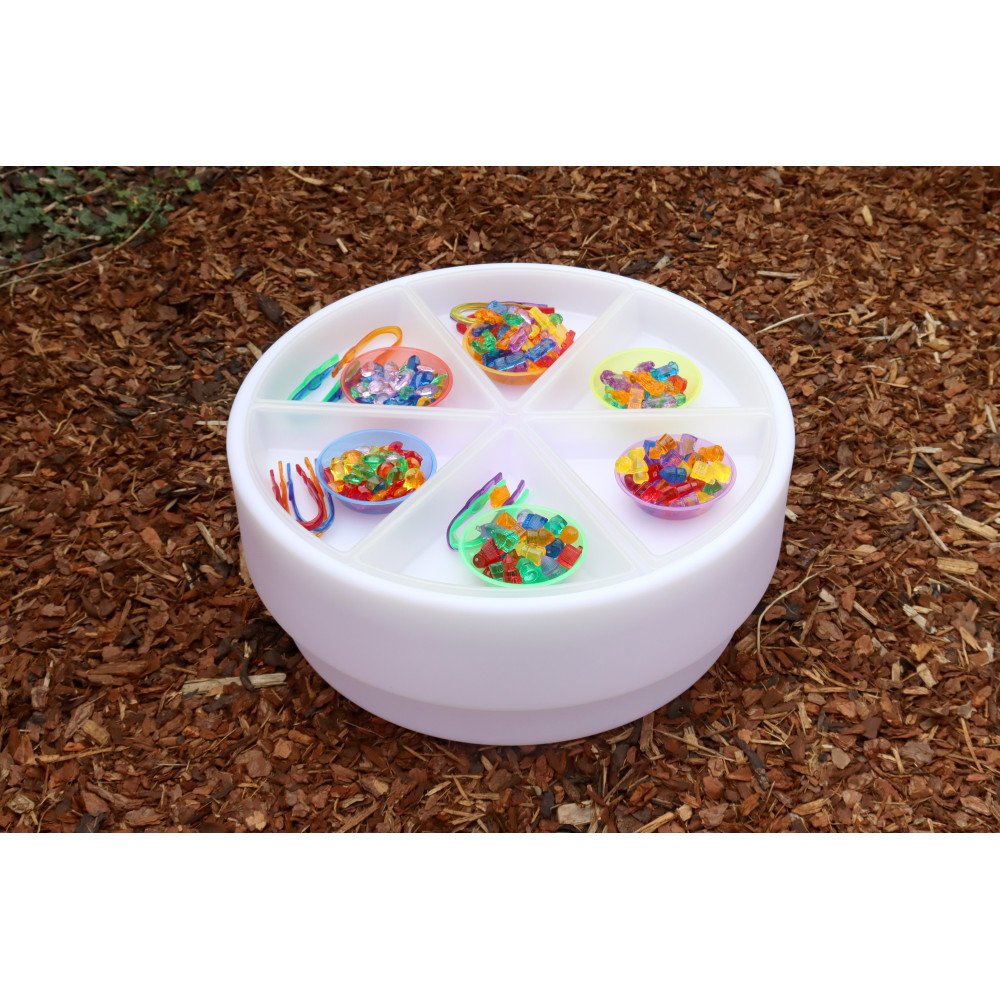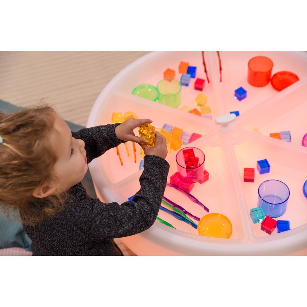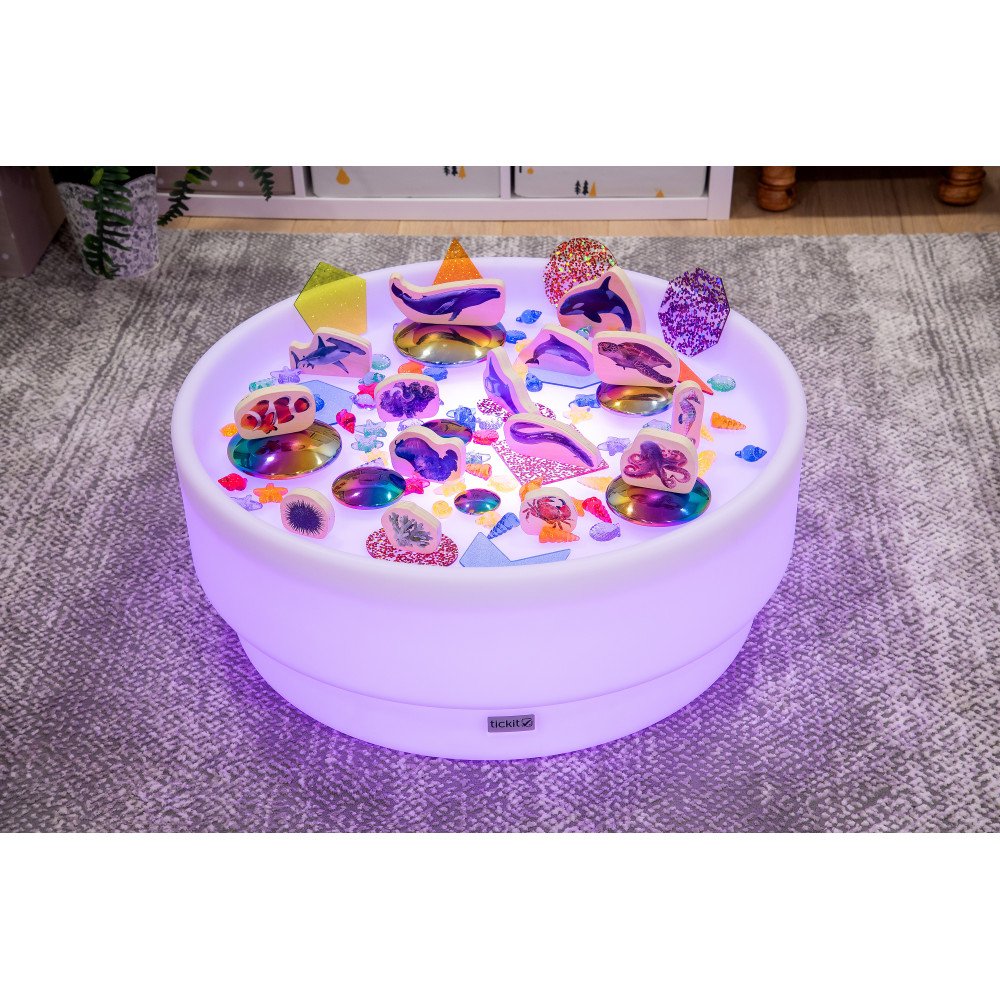 Paaukštintas kraštelis leidžia stalą pildyti vandeniu, smėliu, putomis ar želė mase, todėl jis puikiai tinka veikloms, kuriose vaikai tyrinėja tekstūras, stebi pokyčius ir mokosi per patirtį. Ant šviečiančio paviršiaus ryškiau matosi permatomos detalės, spalvos ir formos, todėl lengviau kurti struktūruotas užduotis – rūšiavimą, dėliojimą, sekas, taip pat mažybinio pasaulio scenas su figūrėlėmis ar gamtinėmis medžiagomis.